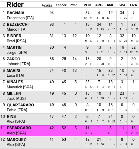 Au vu de la saison passée et des essais hivernaux, l’entame du championnat est effectivement décevante pour celui qui a terminé 4e l’an passé. Il occupe actuellement la 11e position du classement général, avec 42 points inscrits contre 94 pour le leader Francesco Bagnaia. Rien de rédhibitoire quand on sait qu’il en reste encore 555 potentiellement à marquer, mais une quinte qu’il convient d’améliorer, son meilleur week-end ayant eu lieu au Mans, avec 13 points inscrits en deux courses.