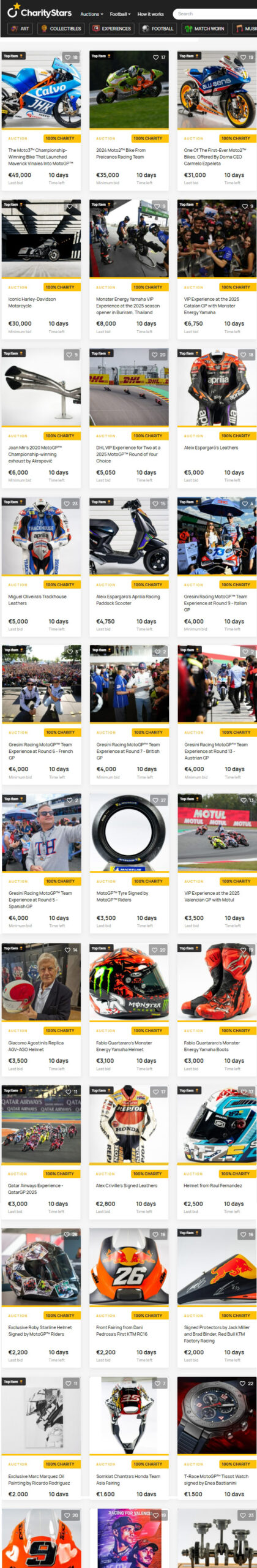 En soutien du MotoGP aux personnes touchées par les inondations à Valence, et en collaboration avec la Croix-Rouge espagnole, s’est tenue une vente aux enchères caritative, sur place et en ligne, lors du Motul Grand Prix Solidarity de Barcelone.