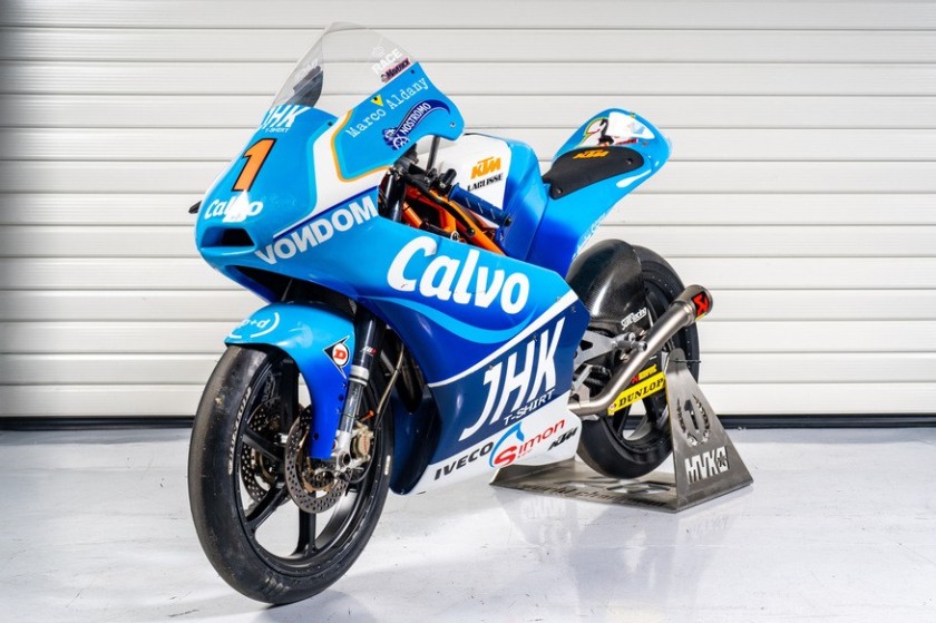 Le catalogue présenté aux fans désireux d’acquérir des pièces uniques pour la bonne cause propose entre autre trois motos de compétition, avec comme point d’orgue la KTM #25 du Team Calvo, championne Moto3™ de Maverick Viñales en 2013 et donnée par son pilote (très très beau geste) avec son cuir de l’époque, mais aussi un des tout premiers prototypes de Moto2 offert par Carmelo Ezpeleta lui-même (BQR-Moto2 #7 pilotée par Dani Rivas en 2010), ainsi que la Kalex 2024 du team Preicanos pilotée par Jaume Masia.