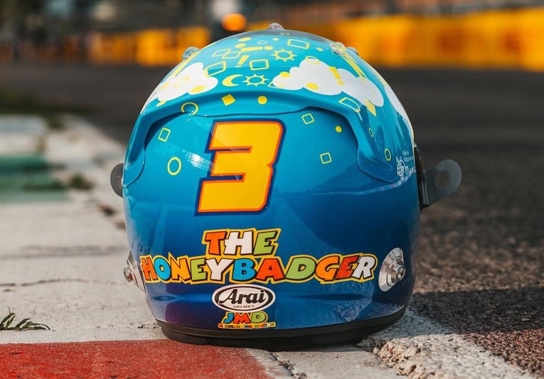 Avant de disputer le Grand Prix d’Italie à Monza, le pilote McLaren a dévoilé une nouvelle décoration de casque pour la course, reprenant le concept du casque porté par Valentino Rossi lors du Grand Prix moto d’Italie 2008 au Mugello. On se souvient tous de la photo du champion italien montrant sa stupeur sur l’AGV de l’icône, et le casque de l’Australien toujours souriant reprend les mêmes codes, y compris la mention Honey Badger, son surnom, qui utilise la typographie et le code couleur de l’Italien.