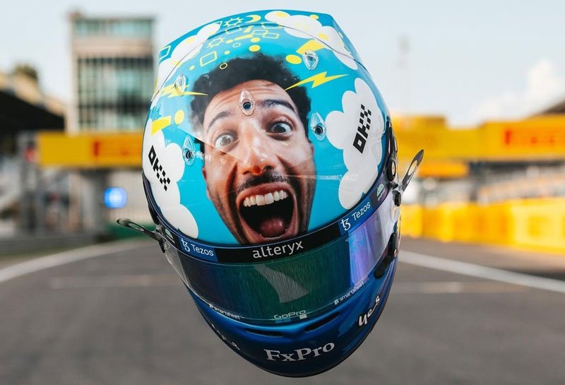 Avant de disputer le Grand Prix d’Italie à Monza, le pilote McLaren a dévoilé une nouvelle décoration de casque pour la course, reprenant le concept du casque porté par Valentino Rossi lors du Grand Prix moto d’Italie 2008 au Mugello. On se souvient tous de la photo du champion italien montrant sa stupeur sur l’AGV de l’icône, et le casque de l’Australien toujours souriant reprend les mêmes codes, y compris la mention Honey Badger, son surnom, qui utilise la typographie et le code couleur de l’Italien.