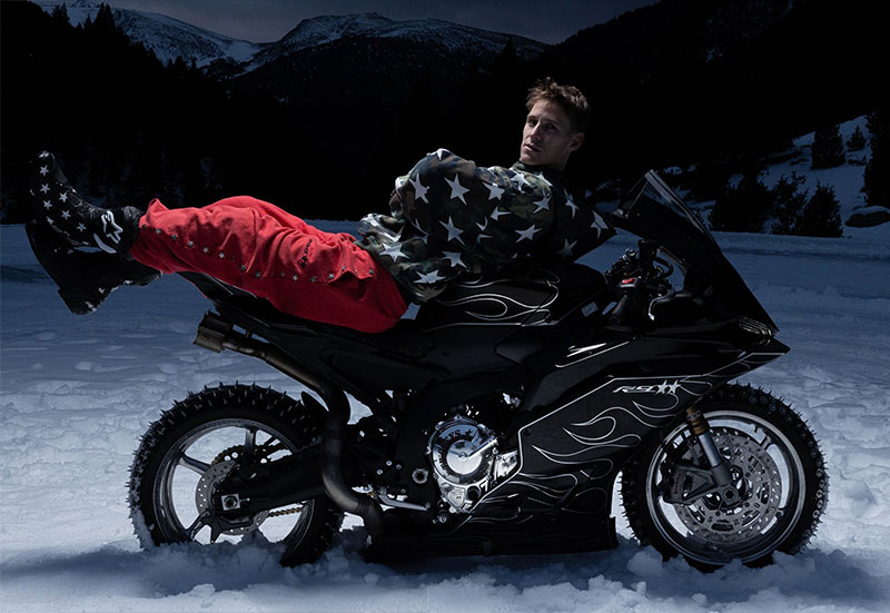 Adoptant une approche différente de sa fonction d’origine, la marque contemporaine de bijoux lifestyle a voulu placer la moto dans un autre contexte, en transformant la neige en piste de course grâce à l’ajout de clous dans les pneus.