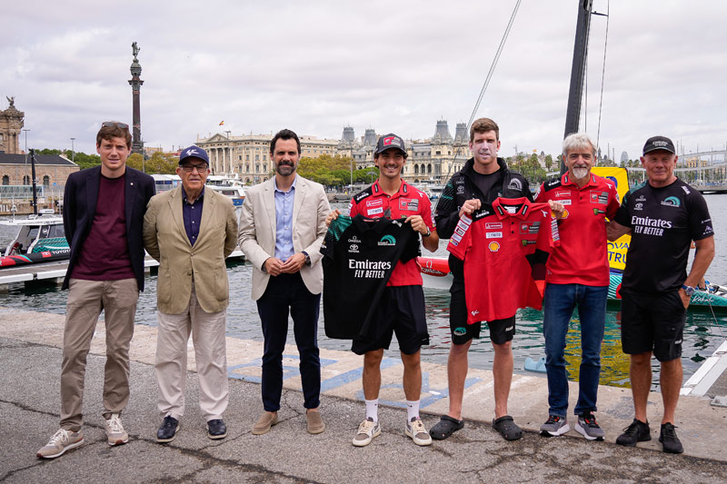De gauche à droite : Oriol Sagrera, Carmelo Ezpeleta, PDG du Circuit de Barcelona-Catalunya, Roger Torrent, PDG de Dorna Sports, Pecco Bagnaia de Ducati Lenovo, le skipper Peter Burling, Gigi Dall’Igna, directeur général de Ducati Corse et Grant Dalton, PDG de l’équipe néo-zélandaise.