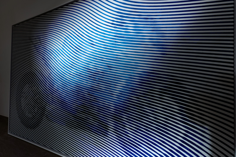 Réalisée sur toile à l’échelle 1:1, l’œuvre se distingue par un entrelacement sophistiqué de lignes bleues, une couleur évocatrice qui rappelle la livrée originale de la Panigale V4 Tricolore Italia. Les trajectoires fluides et qui ne se croisent jamais créent une illusion d’optique de mouvement et de profondeur, projetant la perception de la vitesse dans une nouvelle dimension artistique captivante.