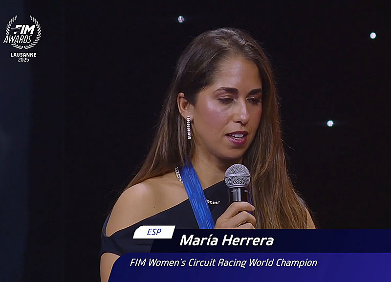 María Herrera : « Bonsoir à tous. C’est certain, j’ai passé beaucoup de temps dans presque toutes ces catégories. J’ai passé six, sept ans en MotoE sur une moto de 260 kilos ou plus. Je suis vraiment heureuse d’être ici. Je n’aurais jamais imaginé partager cette soirée avec Marc Márquez ou Toni Bou, par exemple. C’est une soirée incroyable pour moi. Et je veux remercier Yamaha, Dorna, et tous ceux qui ont rendu ce championnat possible. Et je veux continuer à me battre. »