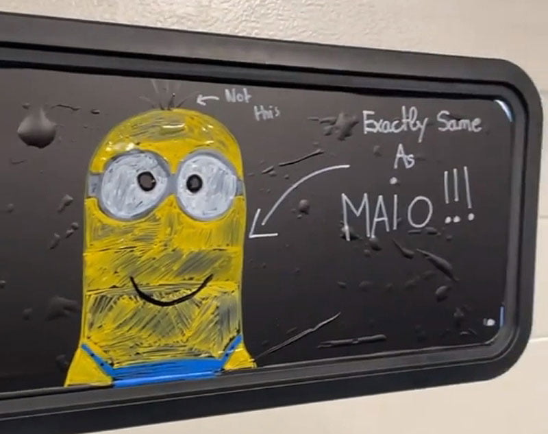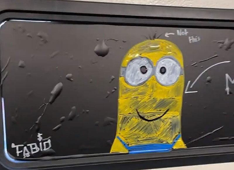 En effet, El Diablo aime bien dessiner, esquisser, griffonner dans le style « street art ». Généralement, le support est tout ce qui lui tombe sous la main, de son carnet de notes à sa valise, mais à Misano cela a pris une autre dimension : Tous les matins, à l’abri des portes fermées du box Monster Energy Yamaha MotoGP, les vitres de celles-ci, recouvertes d’adhésif noir, ont vu apparaître diverses figures et caricatures, détendant l’atmosphère avant la première séance.