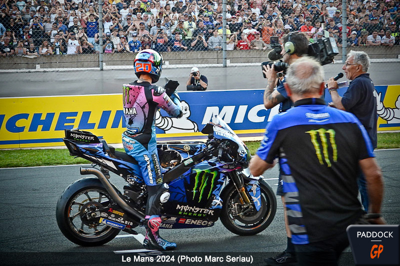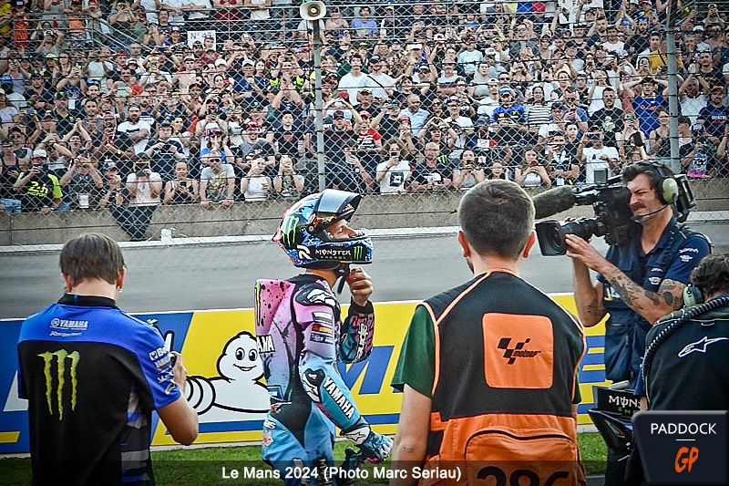 Effectivement, elle est revêtue d’une décoration spéciale, et c’est Fabio Quartararo à son guidon. Les clameurs de la foule se font encore plus fortes, et le pilote français joue le jeu, haranguant cell-ci par des mouvements des bras. Ce soutien dans une période pas facile lui fait visiblement chaud au cœur et il « donnera tout » demain pour faire plaisir à son public national.