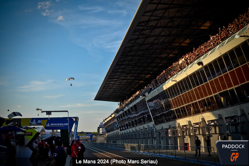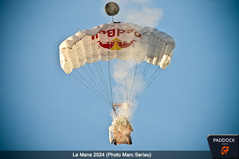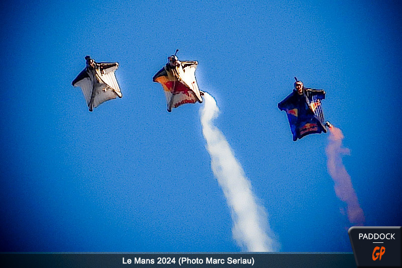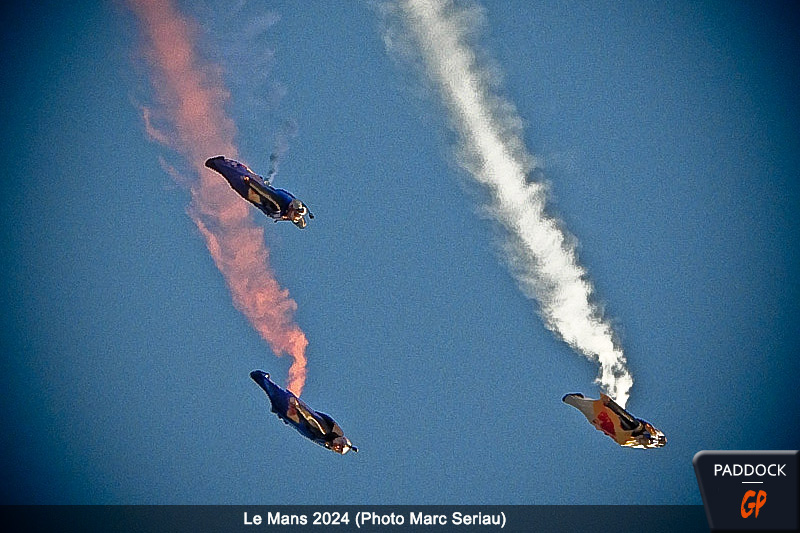 Tout d’abord, les têtes se sont levées vers le ciel limpide de la fin de journée sarthoise pour apercevoir les quatre sillages laissés par la formation des Red Bull Wingsuiters lâchés à 2500 mètres d’altitude.