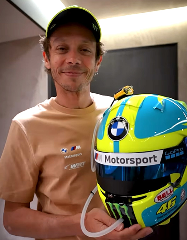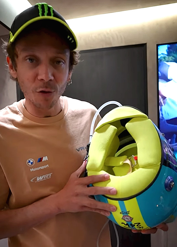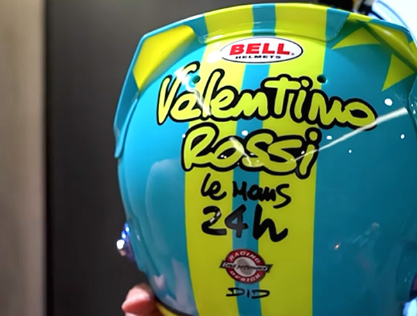 « Je vous présente le casque spécial pour les 24 Heures du Mans. Nous voulions évoquer les casques légendaires des 24 Heures du Mans des années 70′ et pour cela nous avons créé le graphisme très simple avec mon jaune fluo avec ces deux lignes qui parcourent le casque, dans un style très 24 Heures du Mans. Puis nous avons ajouté le soleil et la lune, et nous voulions aussi une couleur vintage. Nous avons trouvé ce bleu clair, car dans ces années-là beaucoup de pilotes portaient des combinaisons un peu bleu clair, pas vraiment blanches mais bleu clair. Et cela, disons que c’est ce que nous avons le plus aimé, car c’est un peu similaire à mon bleu, mais en plus vintage, ce qui donne cet effet des années 70′. Nous avons ensuite fait l’intérieur en jaune fluo, puis il y a l’inscription Valentino Rossi écrite différemment, car c’est mon écriture. J’ai donc écrit moi-même « Valentino Rossi Le Mans 24H ». Et pour continuer sur la même ligne, nous avons utilisé la marque d’Aldo et de Davide de ces années-là. J’ai ensuite naturellement ajouté le numéro 46, le drapeau italien, et nous étions prêts. Ce casque rend très bien, il est très beau, et maintenant il ne reste plus qu’à bien faire. »