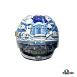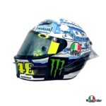 Après la version 2015 toute de jaune cristallisée, puis la version 2016 et son bonhomme de neige sur fond bleu, la livrée 2017 du casque de Valentino Rossi pour les tests de pré-saison se pare du bleu et blanc d’une froide nuit hivernale sur Tavullia.