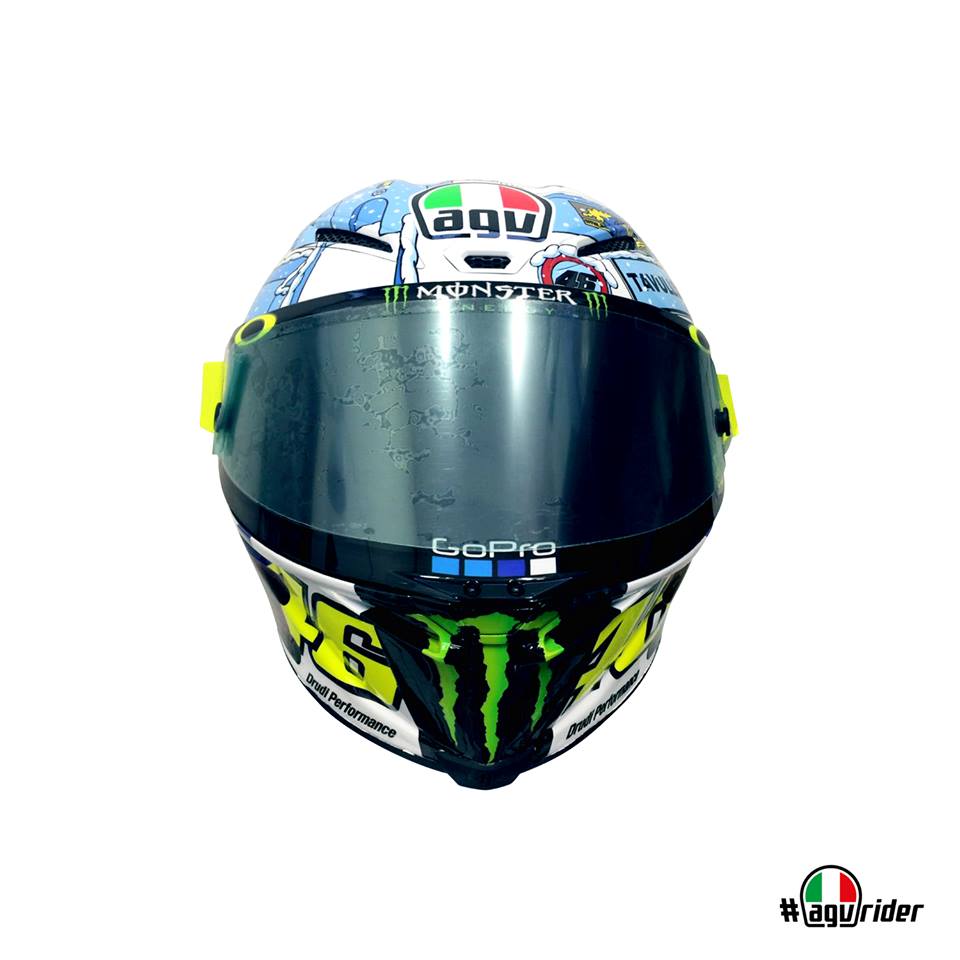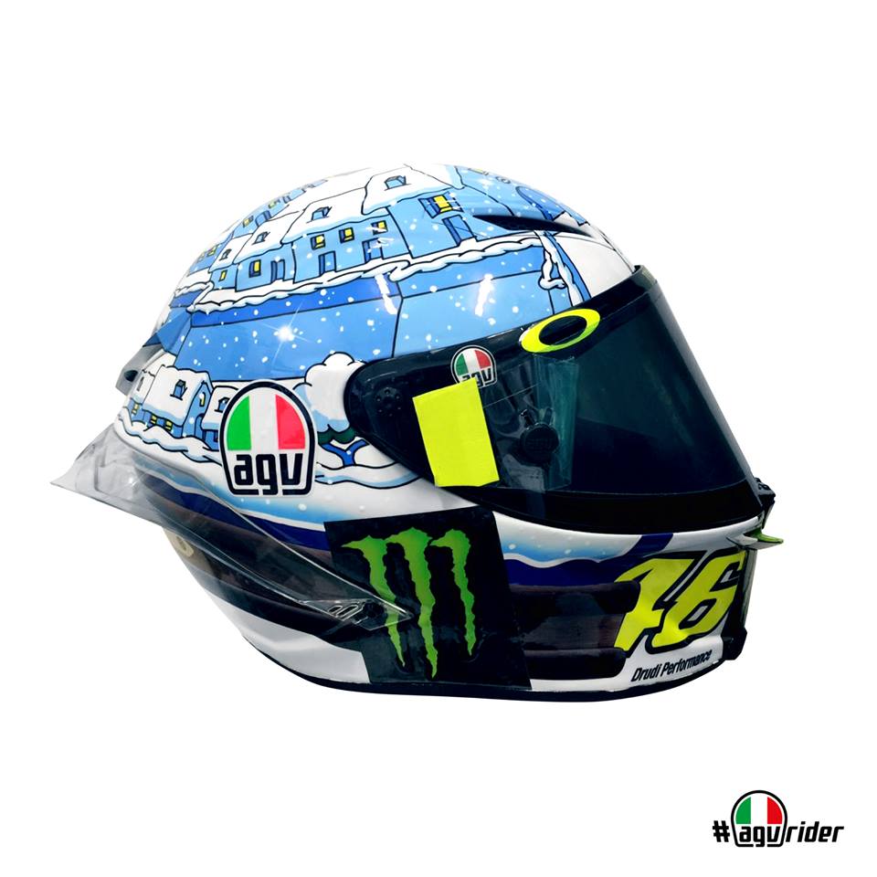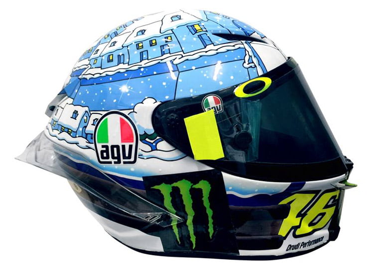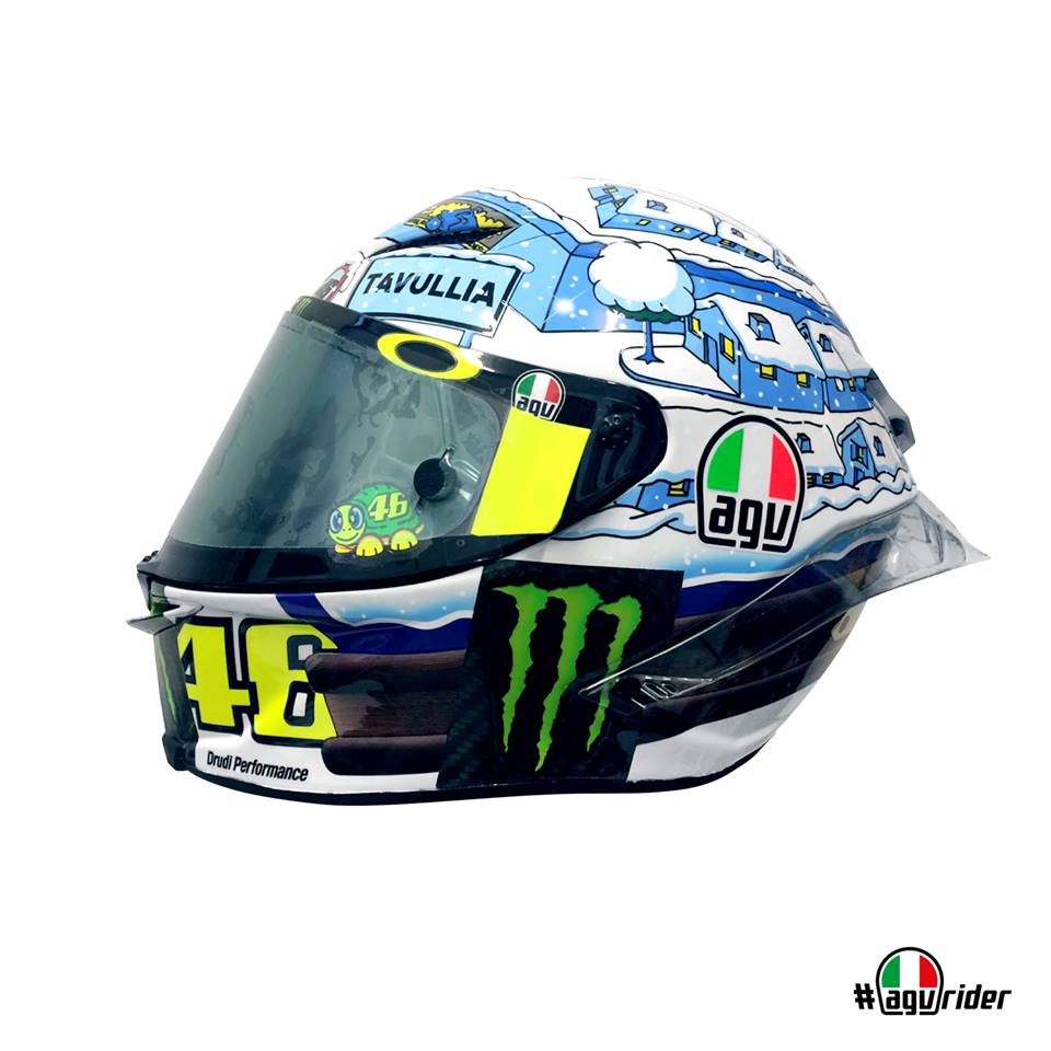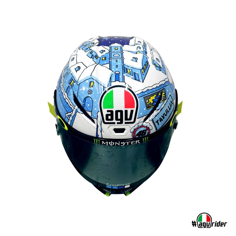 Après la version 2015 toute de jaune cristallisée, puis la version 2016 et son bonhomme de neige sur fond bleu, la livrée 2017 du casque de Valentino Rossi pour les tests de pré-saison se pare du bleu et blanc d’une froide nuit hivernale sur Tavullia.