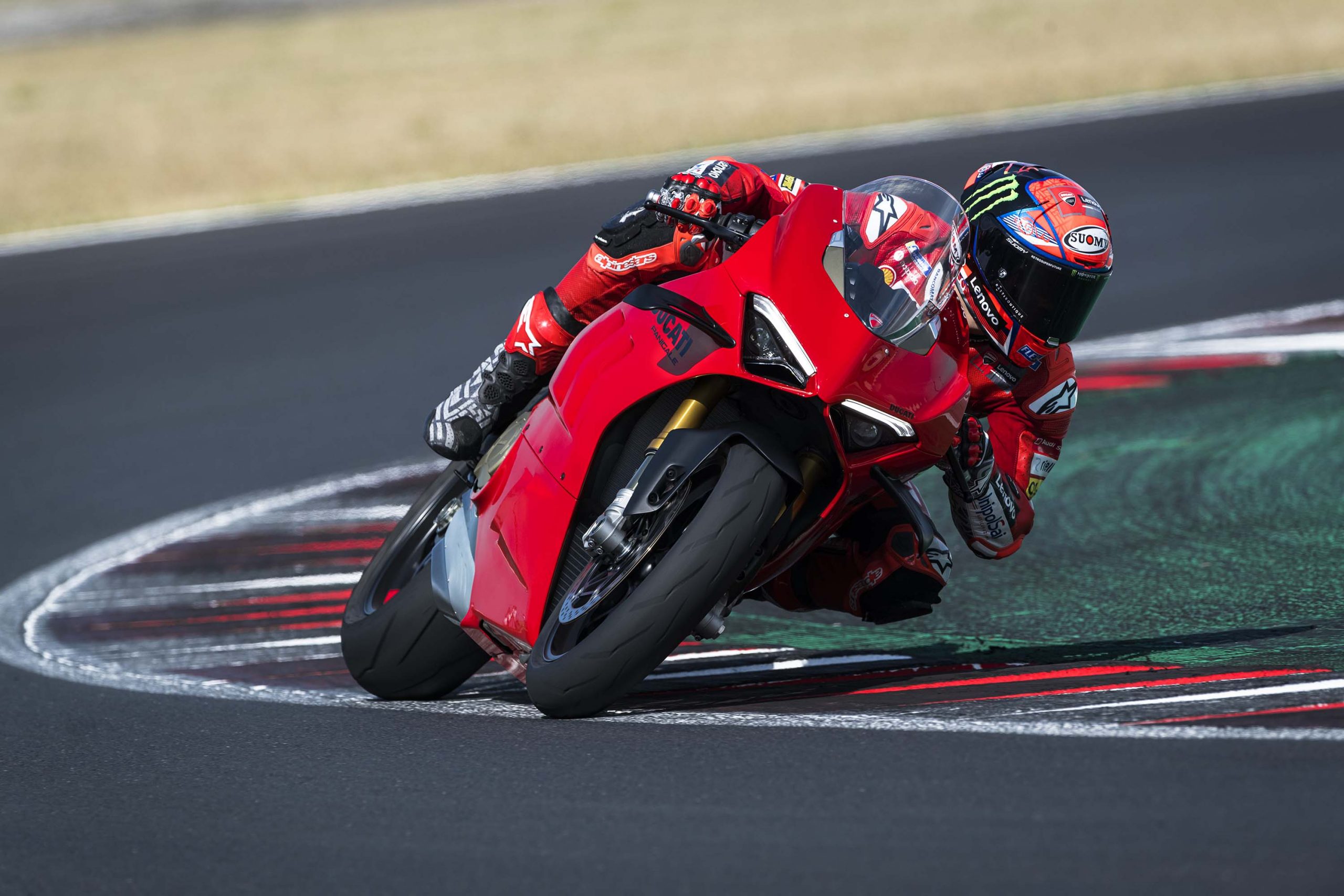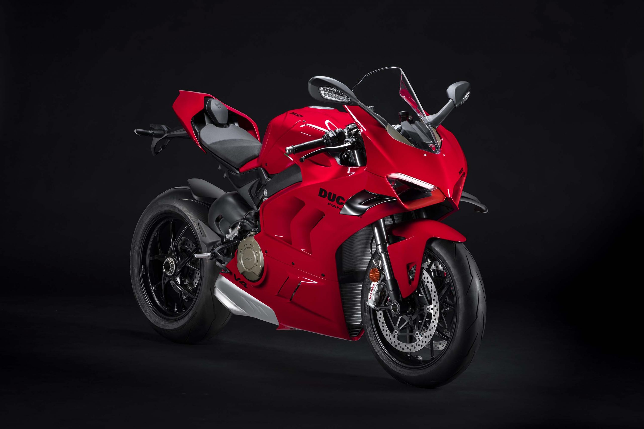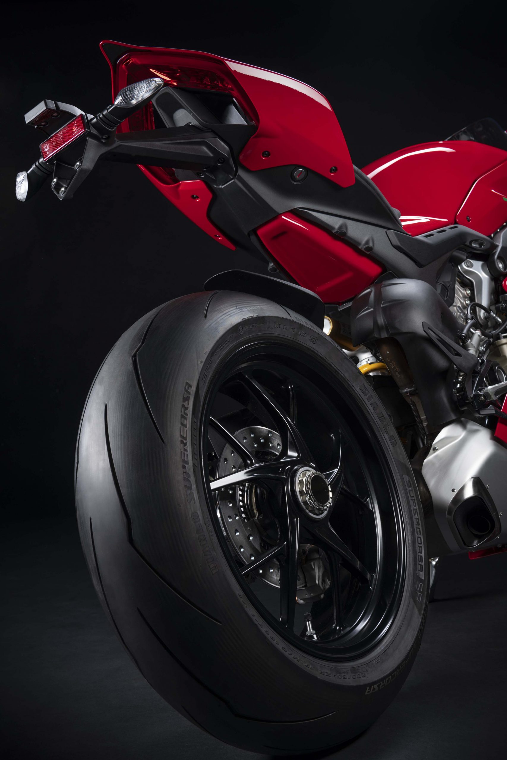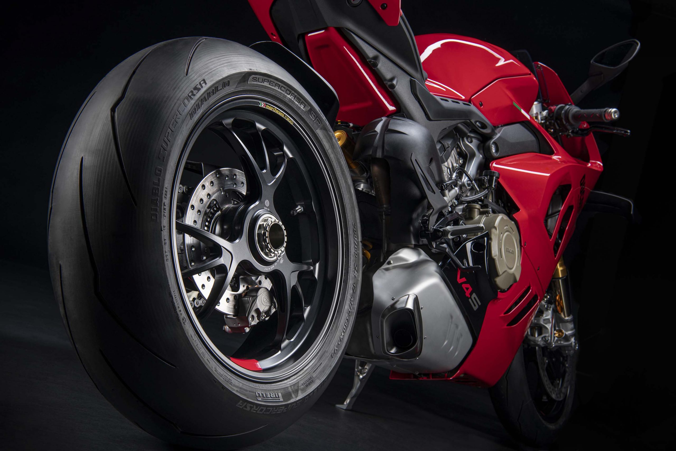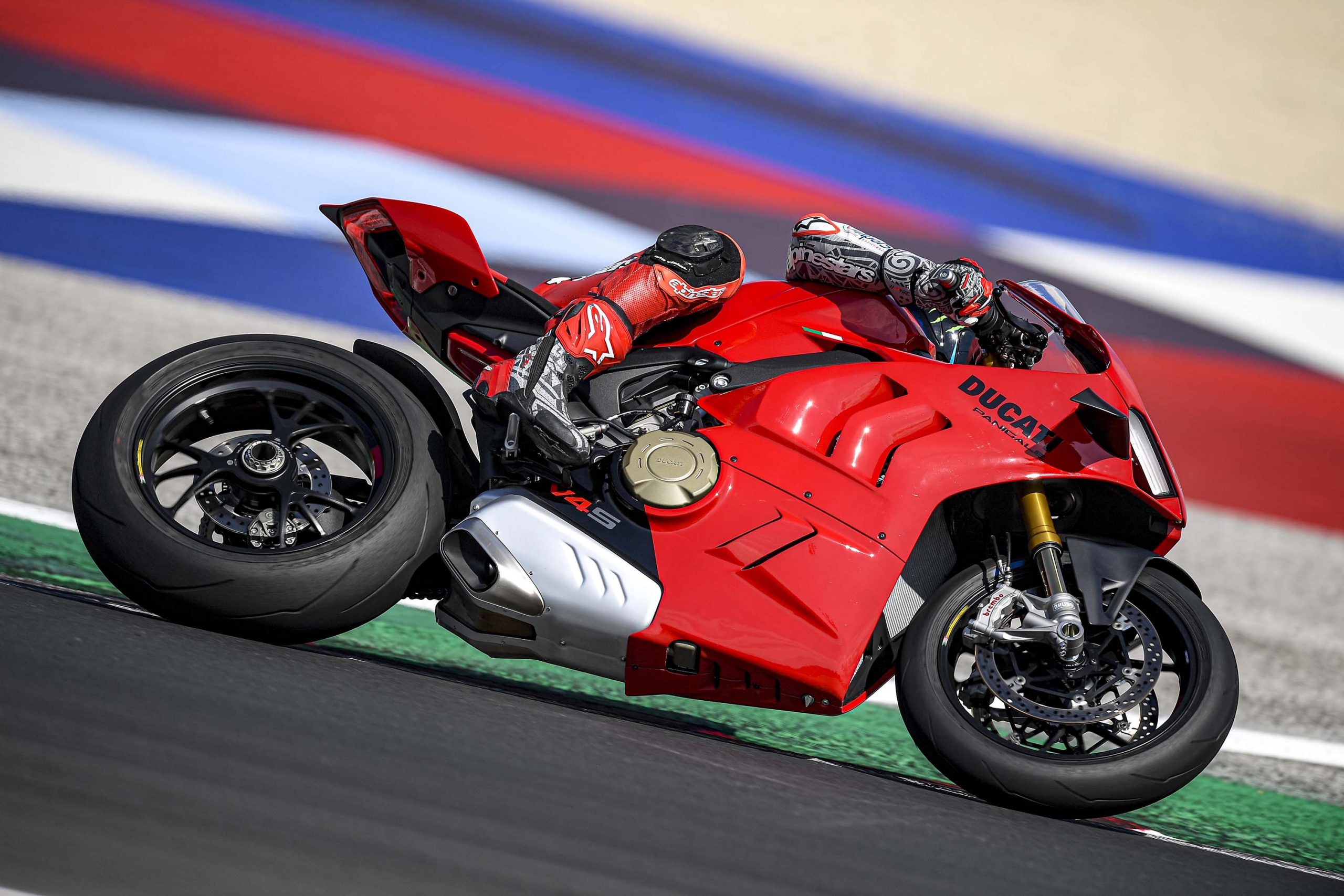 Avec son V4 Desmosedici Twin Pulse à 90° de 1103 cc qui développe 215 ch à 13 000 tr/min, un vilebrequin contre-rotatif, une boite de vitesse qui reprend l’étagement de celle de la V4 R de Superbike, les contrôles de traction, de glisse, du frein moteur et du wheeling, une ligne titane Akrapovic, un shifter bidirectionnel, des freins Brembo Stylema, des ailerons apportant 37 kg d’appui à 300 km/h et quelques autres friandises que l’on peut compléter par la version S dotée de jantes en aluminium forgées, d’une batterie Lithium et de suspensions semi-actives Öhlins Smart EC 2.0, la dernière production de Borgo Panigale n’est pas bien loin d’une Superbike adaptée à la route !