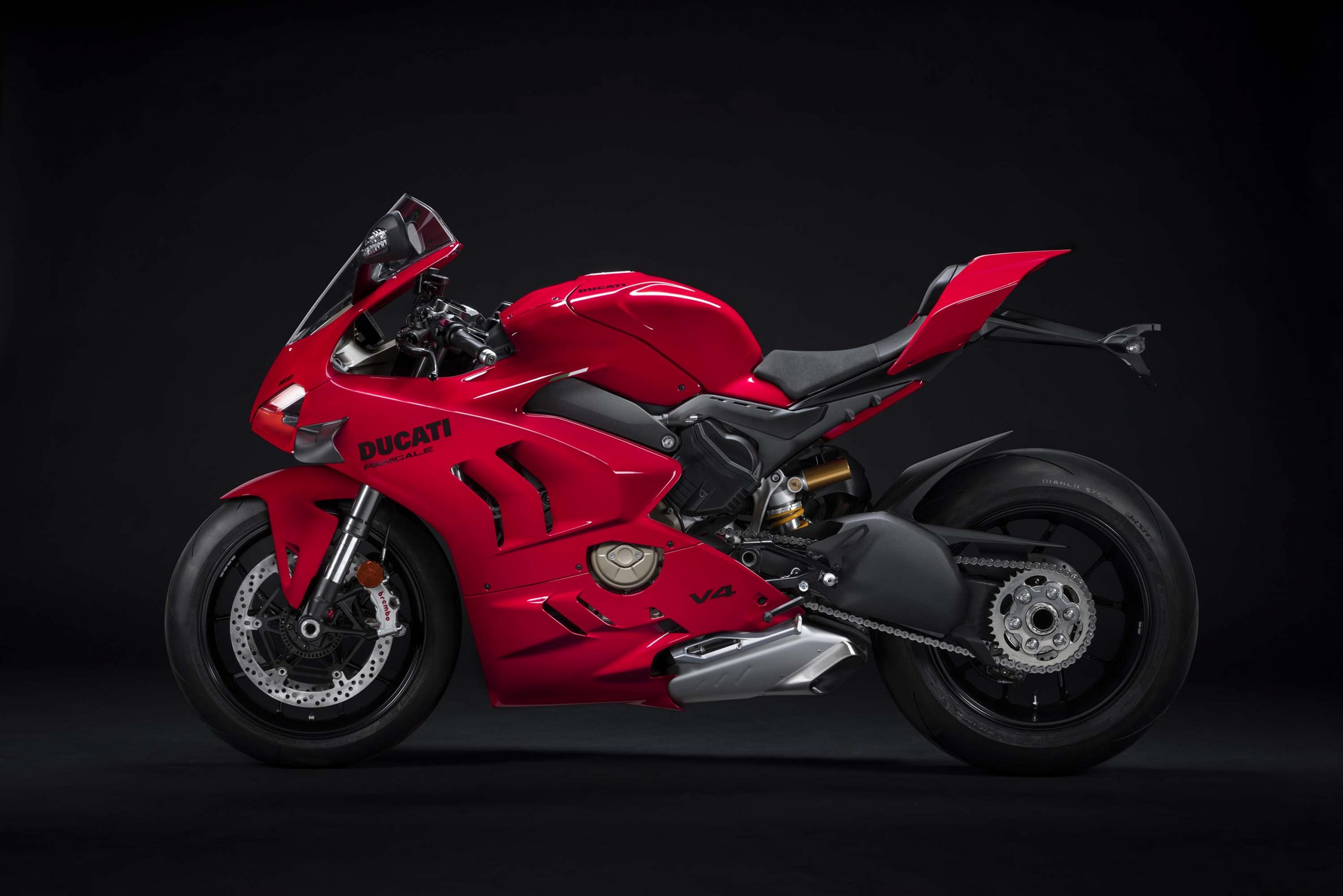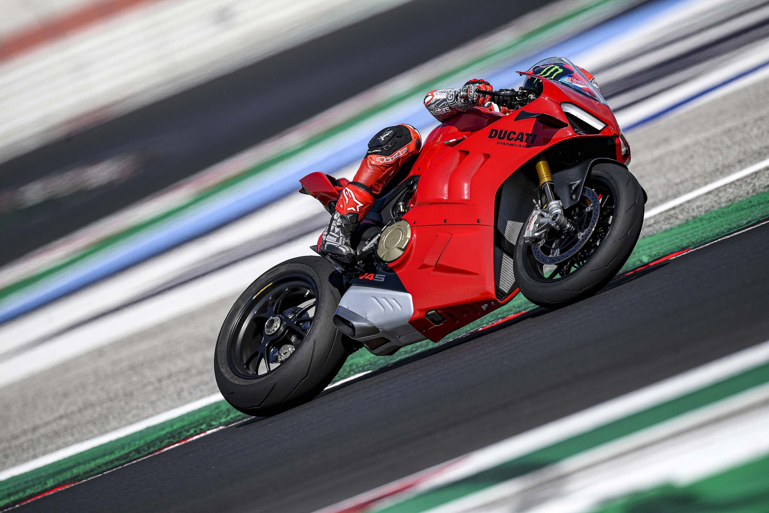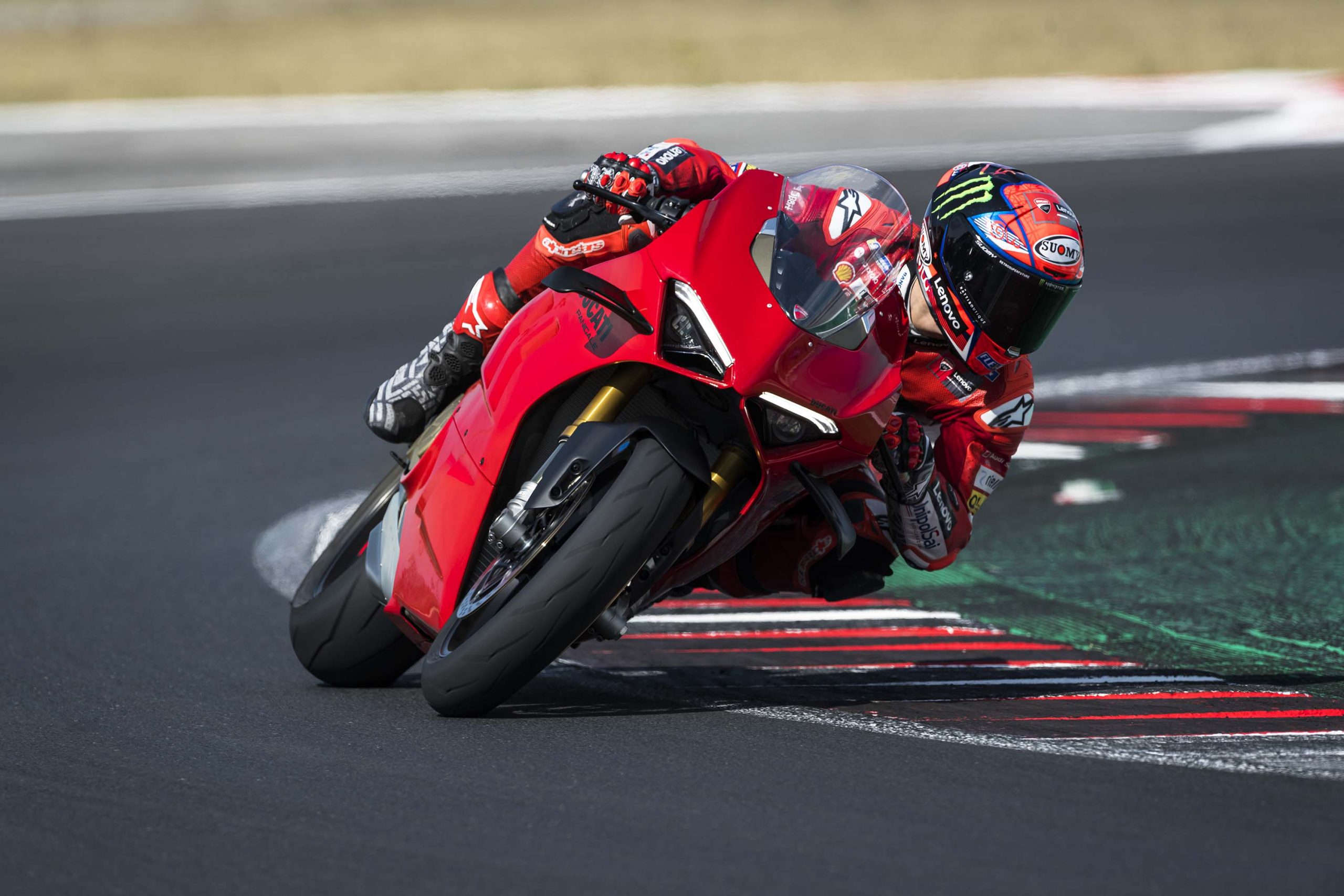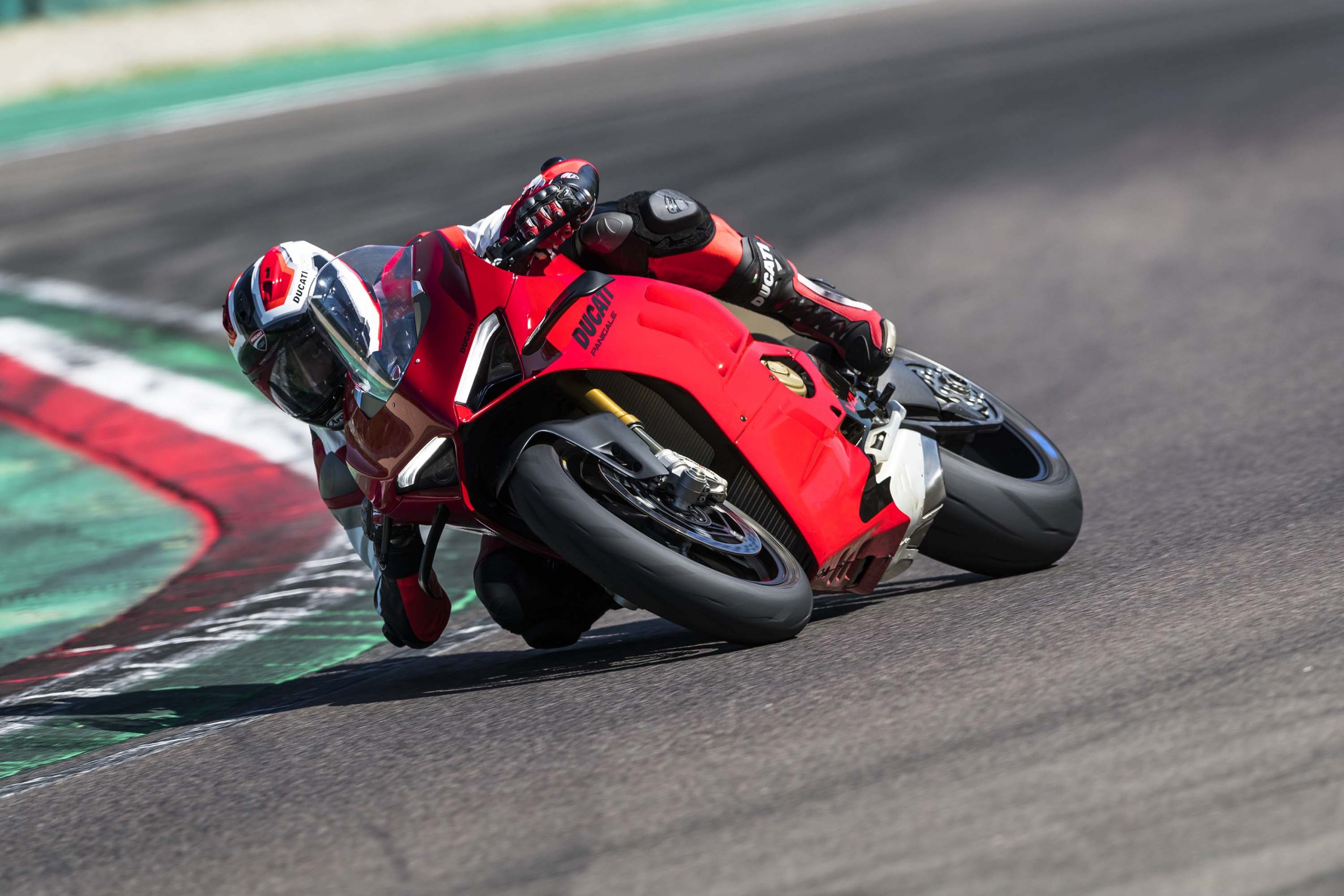 Avec son V4 Desmosedici Twin Pulse à 90° de 1103 cc qui développe 215 ch à 13 000 tr/min, un vilebrequin contre-rotatif, une boite de vitesse qui reprend l’étagement de celle de la V4 R de Superbike, les contrôles de traction, de glisse, du frein moteur et du wheeling, une ligne titane Akrapovic, un shifter bidirectionnel, des freins Brembo Stylema, des ailerons apportant 37 kg d’appui à 300 km/h et quelques autres friandises que l’on peut compléter par la version S dotée de jantes en aluminium forgées, d’une batterie Lithium et de suspensions semi-actives Öhlins Smart EC 2.0, la dernière production de Borgo Panigale n’est pas bien loin d’une Superbike adaptée à la route !
