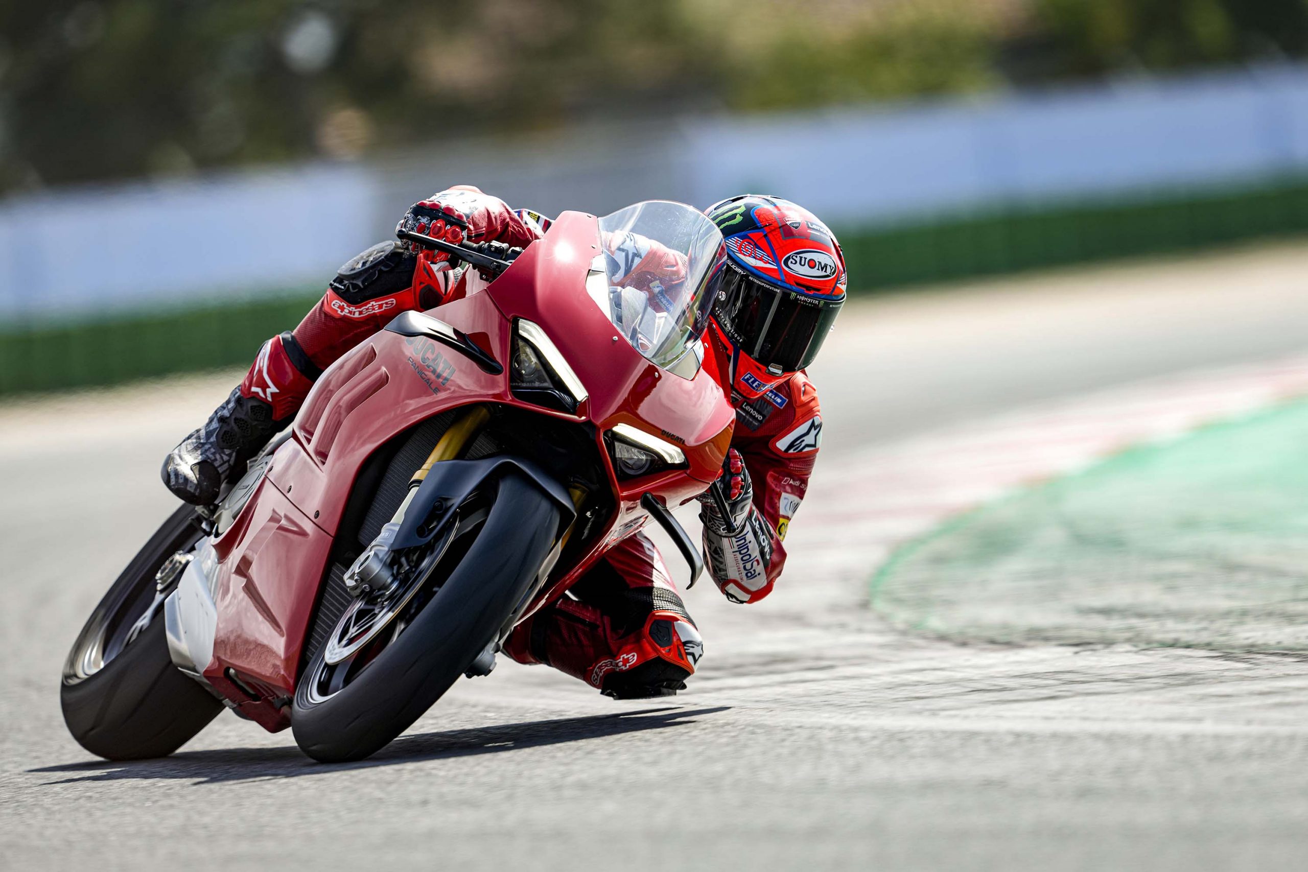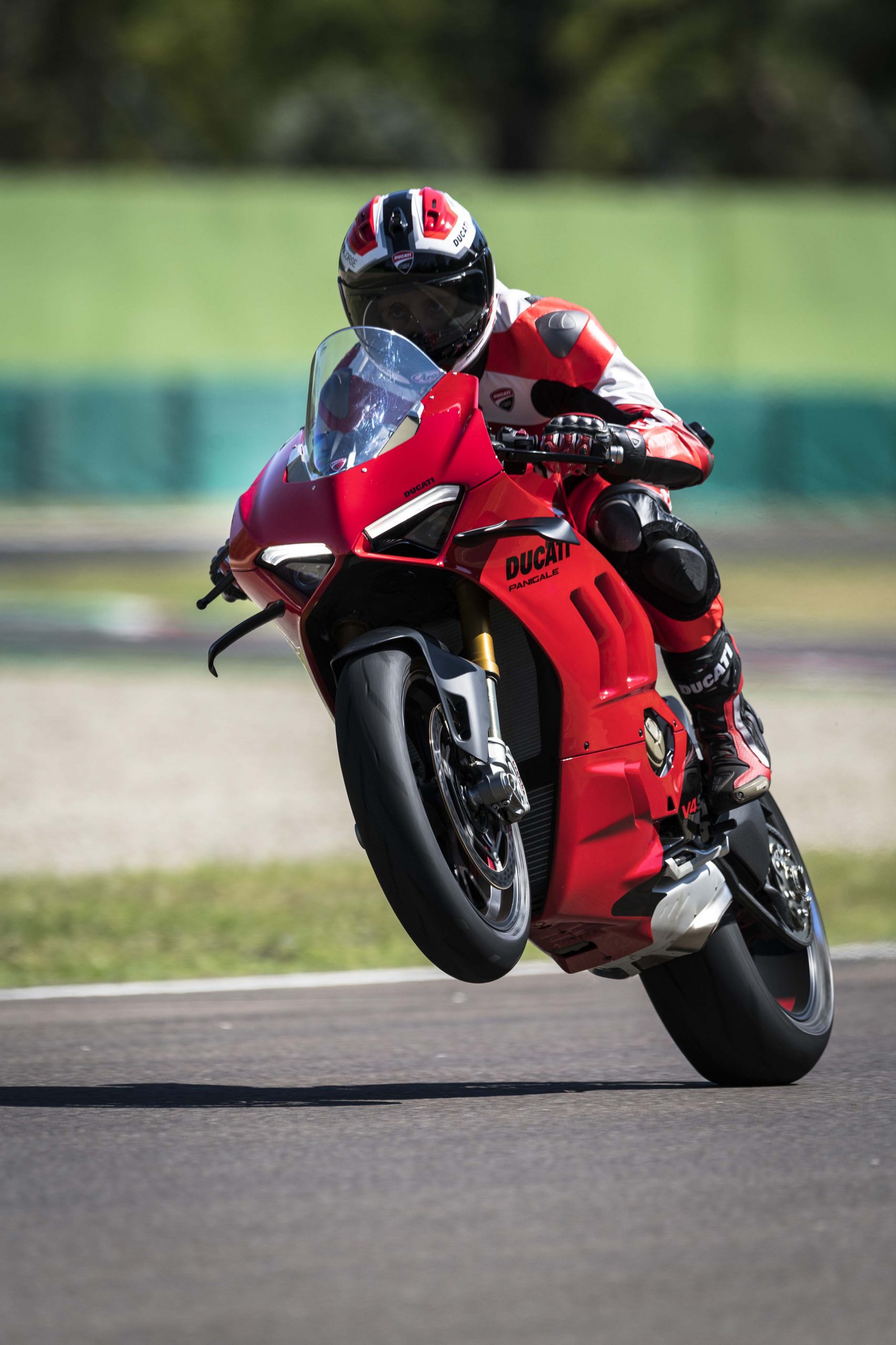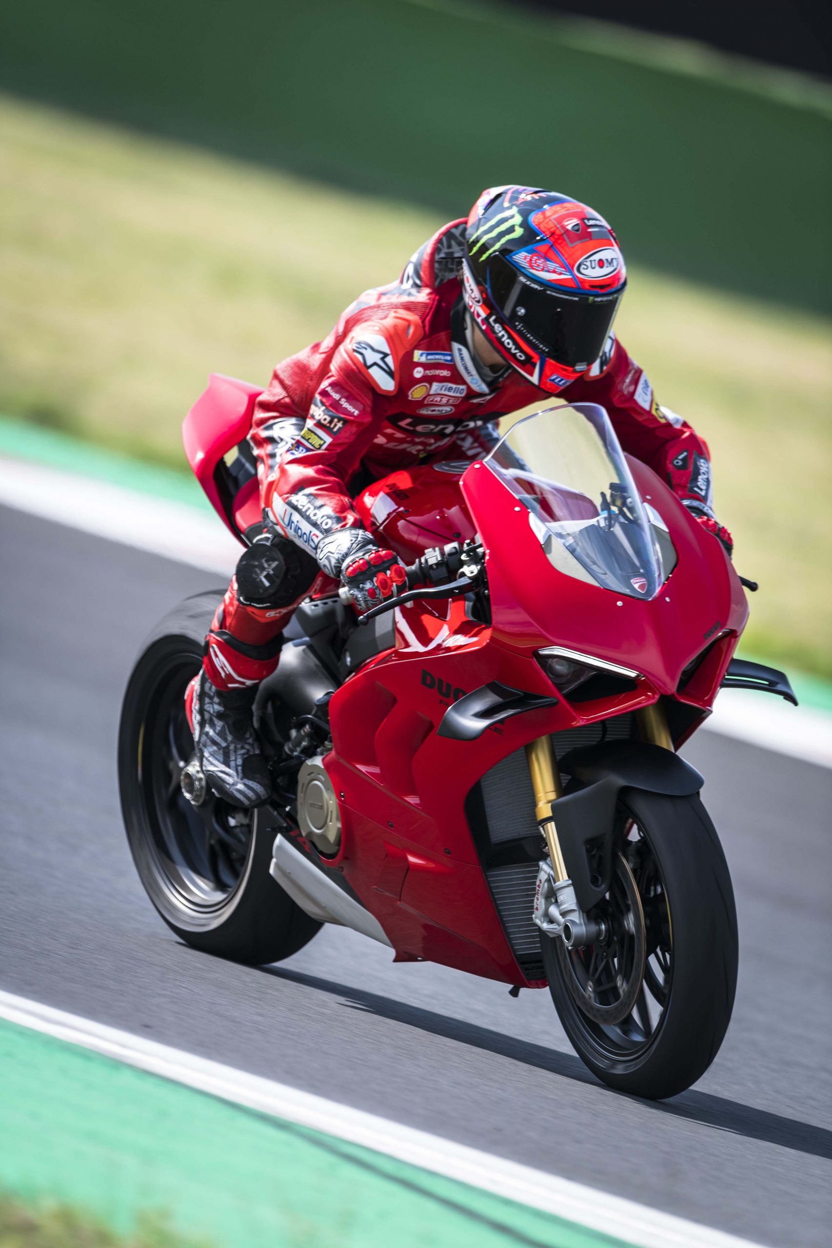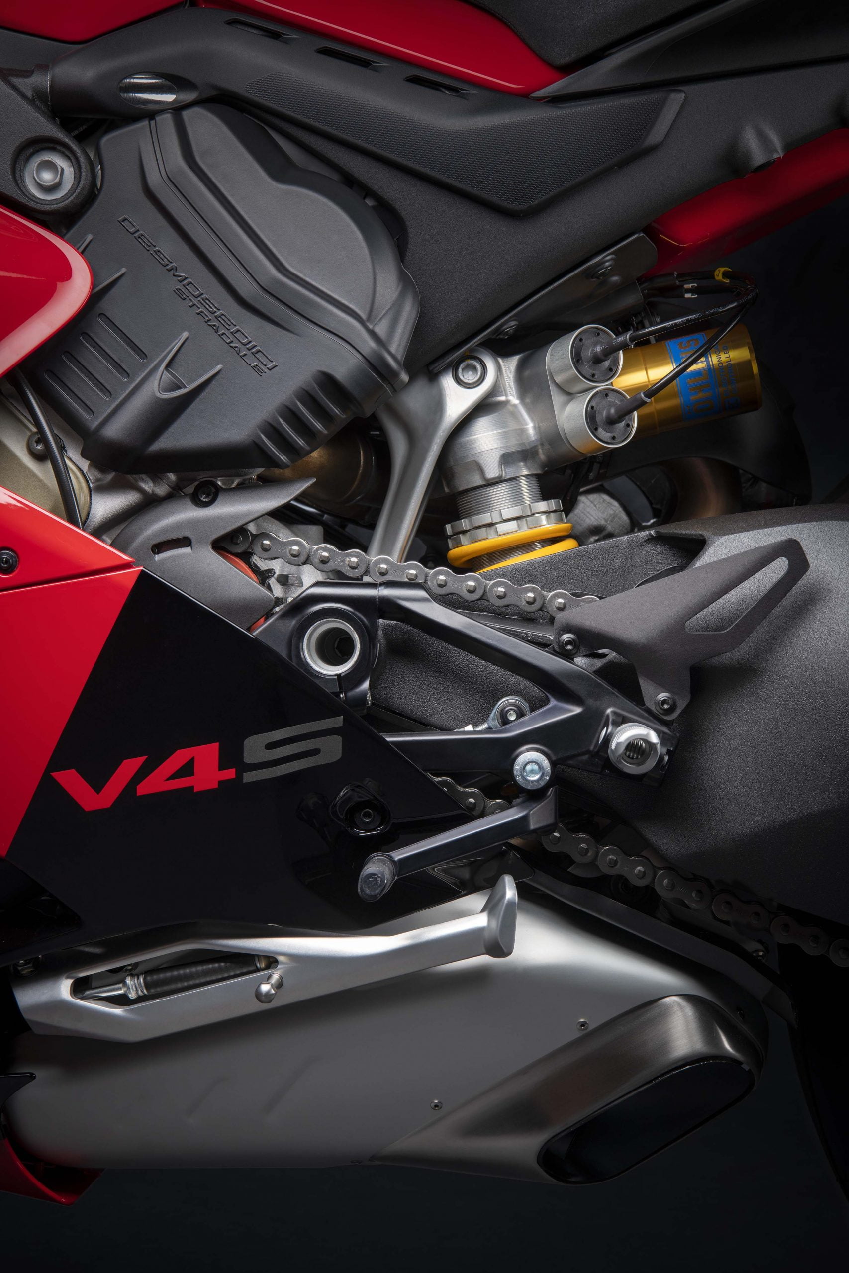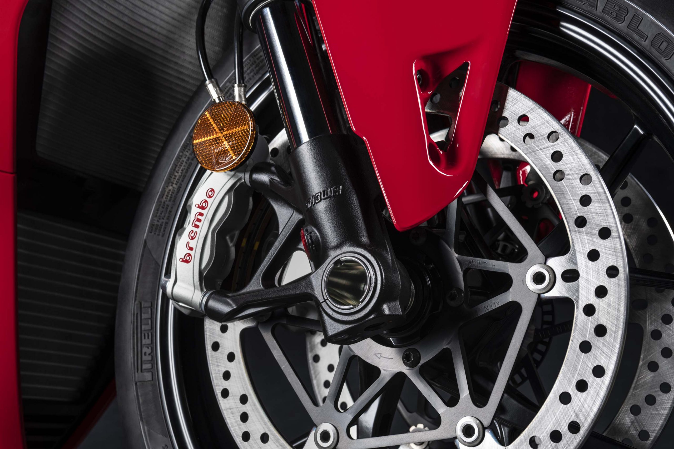 Avec son V4 Desmosedici Twin Pulse à 90° de 1103 cc qui développe 215 ch à 13 000 tr/min, un vilebrequin contre-rotatif, une boite de vitesse qui reprend l’étagement de celle de la V4 R de Superbike, les contrôles de traction, de glisse, du frein moteur et du wheeling, une ligne titane Akrapovic, un shifter bidirectionnel, des freins Brembo Stylema, des ailerons apportant 37 kg d’appui à 300 km/h et quelques autres friandises que l’on peut compléter par la version S dotée de jantes en aluminium forgées, d’une batterie Lithium et de suspensions semi-actives Öhlins Smart EC 2.0, la dernière production de Borgo Panigale n’est pas bien loin d’une Superbike adaptée à la route !
