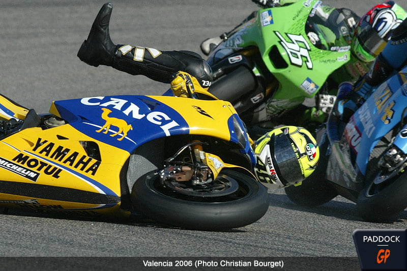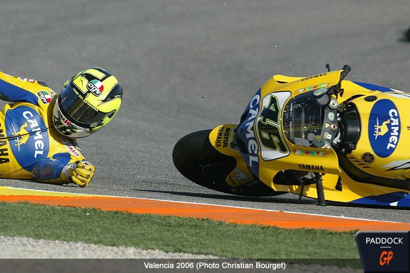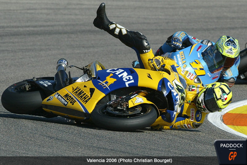 En 2013, Valentino Rossi se souvient de cette chute et précise: « Dans ma carrière, je ne suis arrivé qu’une seule fois en me battant pour le titre lors de la dernière course de l’année. Je me souviens que j’étais un peu inquiet en 2006, car Valence n’est pas ma piste préférée. J’avais un avantage car j’ai eu un peu de chance à Estoril, quand Dani et Nicky se sont touchés, mais déjà un mauvais feeling car Elias m’a battu sur la ligne au Portugal par seulement 0,002s. J’ai pensé que « hmmm, ces cinq points sont vraiment importants ». Mais Valence a été un week-end très étrange pour moi car je survolais le vendredi et samedi. J’ai fait la pole position mais j’ai aussi été très, très fort en rythme de course avec les pneus durs. J’étais donc assez détendu pour le dimanche. Mais le dimanche, dès le matin, quelque chose s’est cassé, quelque chose n’allait pas, parce que j’étais très lent. C’est étrange. Il s’est passé quelque chose d’étrange, je crois. Mais de toute façon, j’ai beaucoup souffert pendant la course et j’ai fait une erreur. Chaque week-end, chaque course a une histoire différente. »