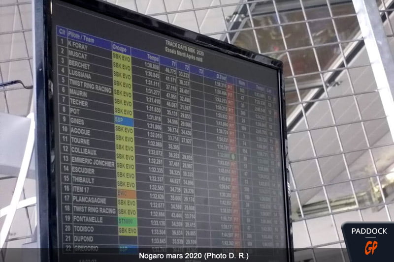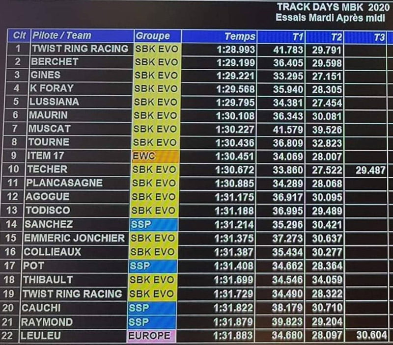 Toutefois, cela a suffit aux pilotes pour reprendre leurs marques, l’ex-pilote de Grand Prix Valentin Debise inscrivant un consistant 1’28.993 en haut de la feuille des temps devant les habitués du Superbike français que sont Morgan Berchet, Matthieu Ginès (Tech Solutions), Kenny Foray (Test Team Dunlop), Mathieu Lussiana, Axel Maurin (Team CMS), David Muscat et autre Alan Techer (Tecmas).