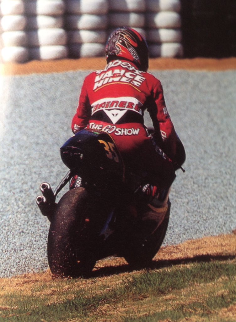 L’équipe Muzzy Kawasaki saute sur l’occasion et engage le prodige à temps complet l’année suivante. D’abord discret, il se révèle à mi-saison et nous gratifie de moments légendaires. Grâce à une régularité digne des plus grands, il parvient à se hisser quatrième au général en 1995. L’ambition était grande pour 1996 mais une vilaine blessure vient entacher sa saison, le contraignant à abandonner le guidon pendant plusieurs mois. Après avoir manqué quatre courses, son retour est programmé pour …Phillip Island. L’enjeu est nul, mais « Go Show » régale les spectateurs en s’imposant par deux fois. Nous tenons ici le futur successeur de Mick Doohan, tout simplement.