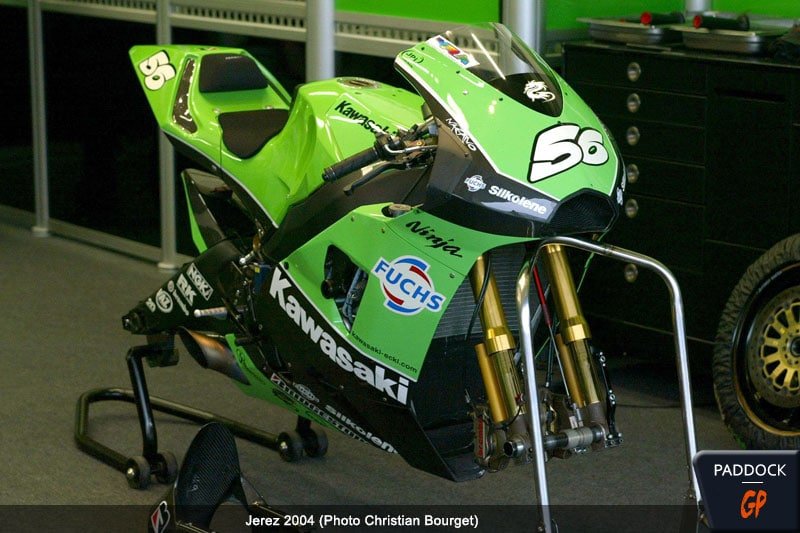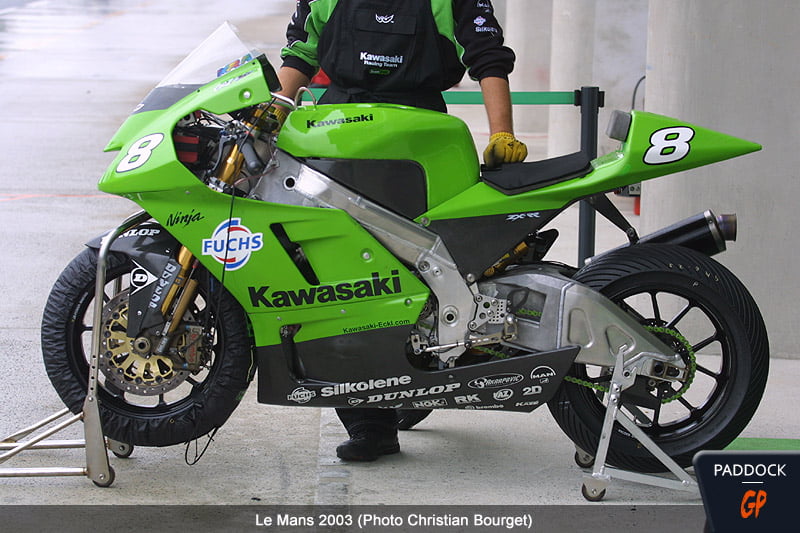 Début 2003, Kawasaki attaque sa première année en MotoGP sous le nom Fuchs Kawasaki, avec une machine relativement classique, dérivée du Superbike.