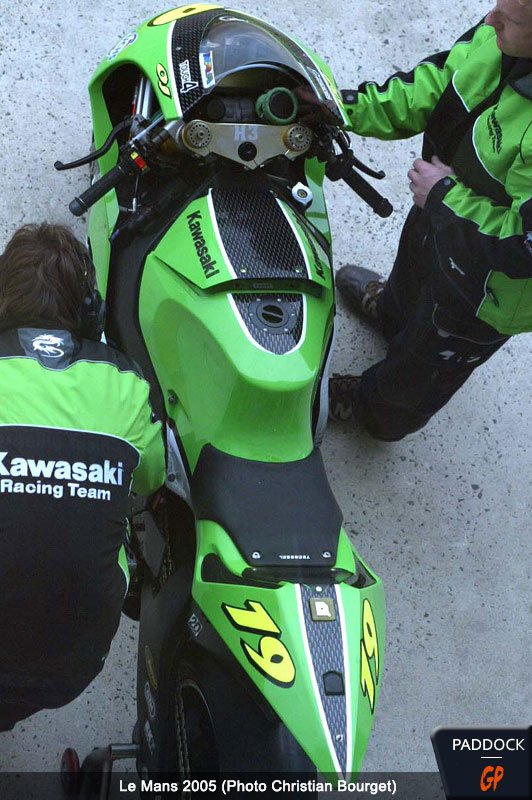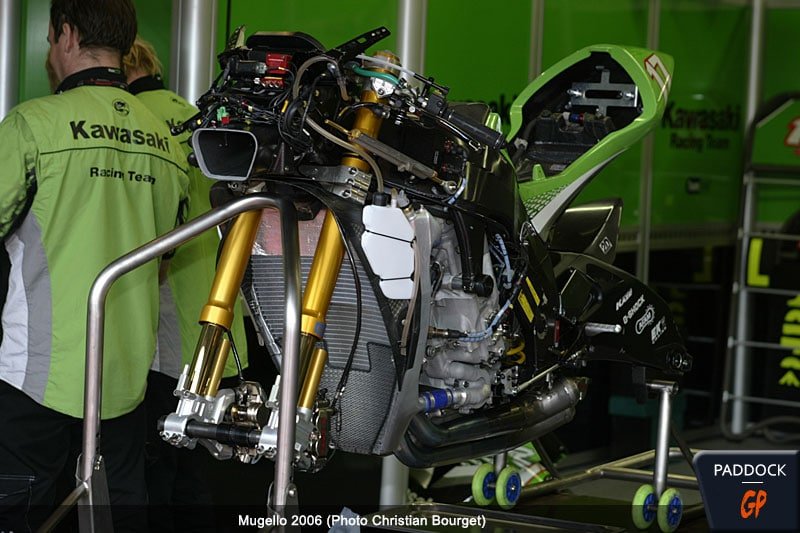 On aperçoit sur la photo le nouveau carénage que le team Kawasaki utilise depuis le Mugello. Conçu par des ingénieurs Kawasaki au Japon, en collaboration avec le même institut de technologie impliqué dans le développement aérodynamique du célèbre train à grande vitesse japonais Shinkansen, le nouveau carénage est censé offrir un certain avantage dans les lignes droites.