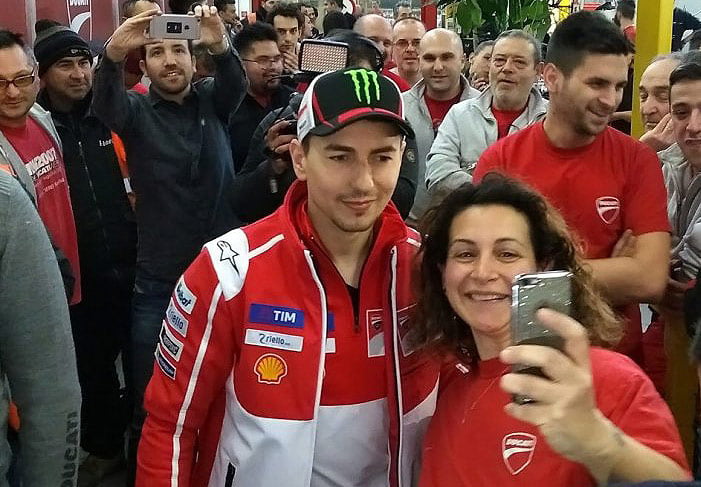 Aujourd’hui, Jorge Lorenzo s’est rendu secrètement au département course de l’usine, mais sa venue n’a pas échappé aux employés Ducati, qui ont commencé à entourer le champion et à se photographier avec lui.