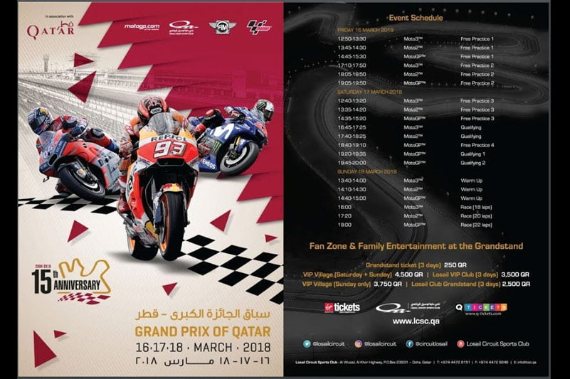 Voici en heure française les horaires du Grand Prix du Qatar, le premier de la saison, qui a la particularité de se disputer en nocturne sous les projecteurs. Le départ de la course MotoGP a été avancé à 17h cette année pour devancer l’arrivée de l’humidité, et les pilotes ont testé le circuit mouillé sans que cela ne posât de problèmes de sécurité.