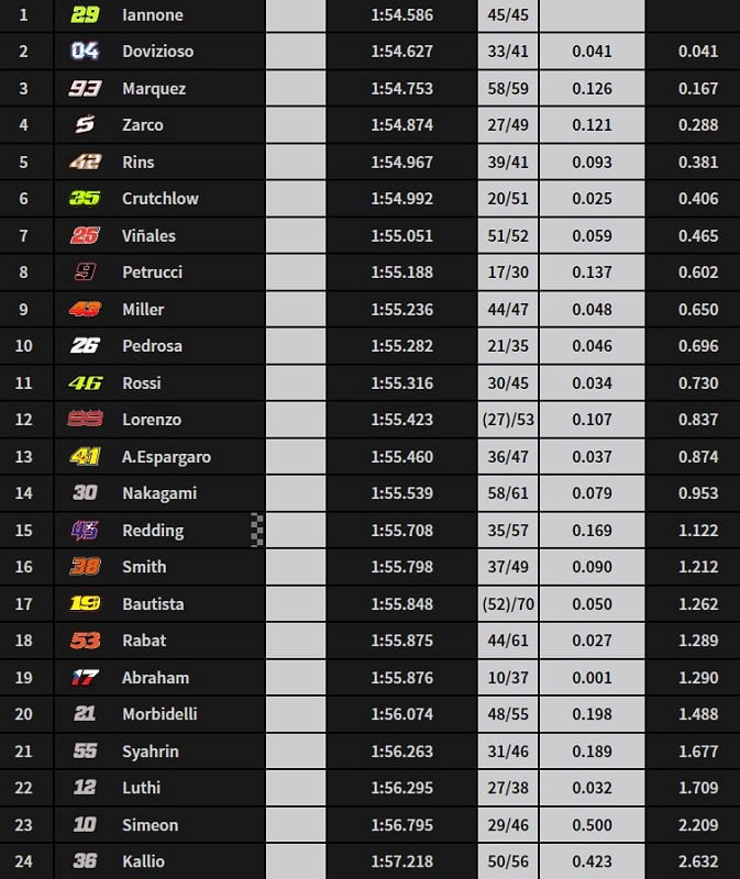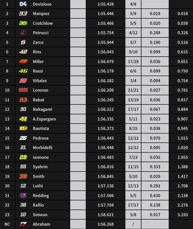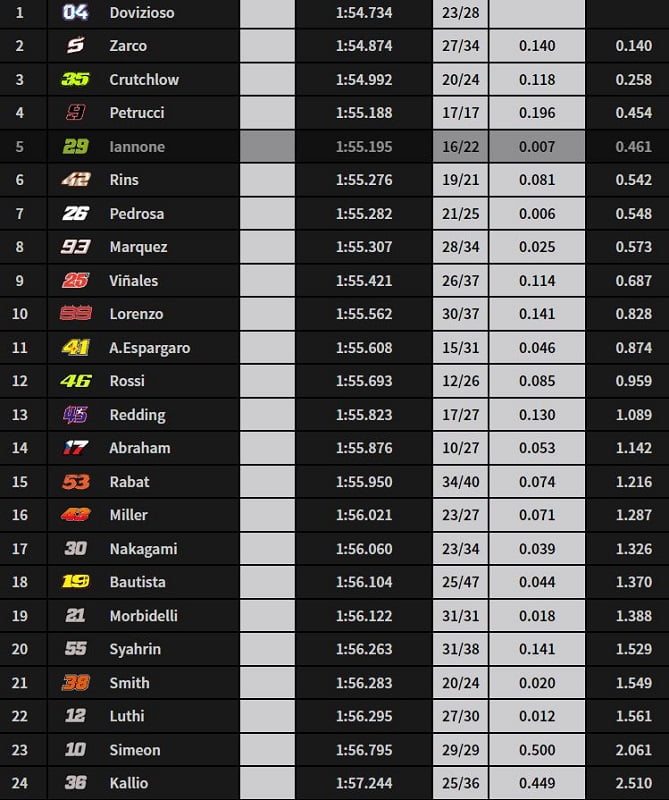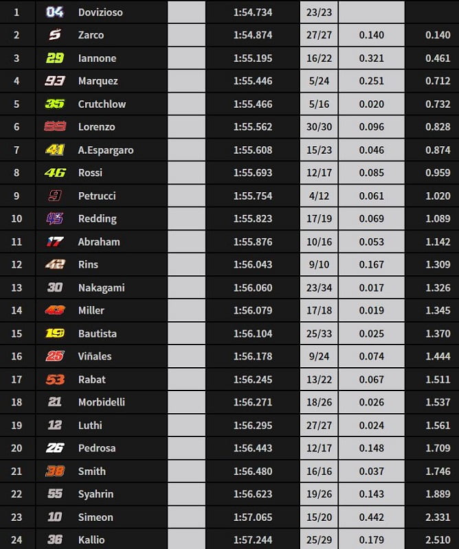 Andrea Dovizioso s’emparait de la première position en 1’54.734, devant Johann Zarco en 1’55.042, les deux hommes étant plus rapide que le meilleur temps de Maverick Vinales la veille (1’55.053). Le temps de Dovizioso était 0.2 plus rapide que le record du tour établi en course en 1’54.927 par Jorge Lorenzo, alors sur Yamaha, en 2016.