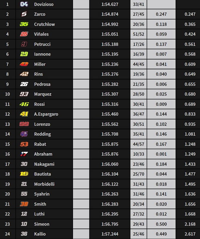 Déjà leader, Andrea Dovizioso améliorait encore le meilleur chrono en 1’54.627. Jorge Lorenzo était alors à presqu’une seconde (0.935) de lui. Dovi précédait le deuxième Johann Zarco de 0.247.