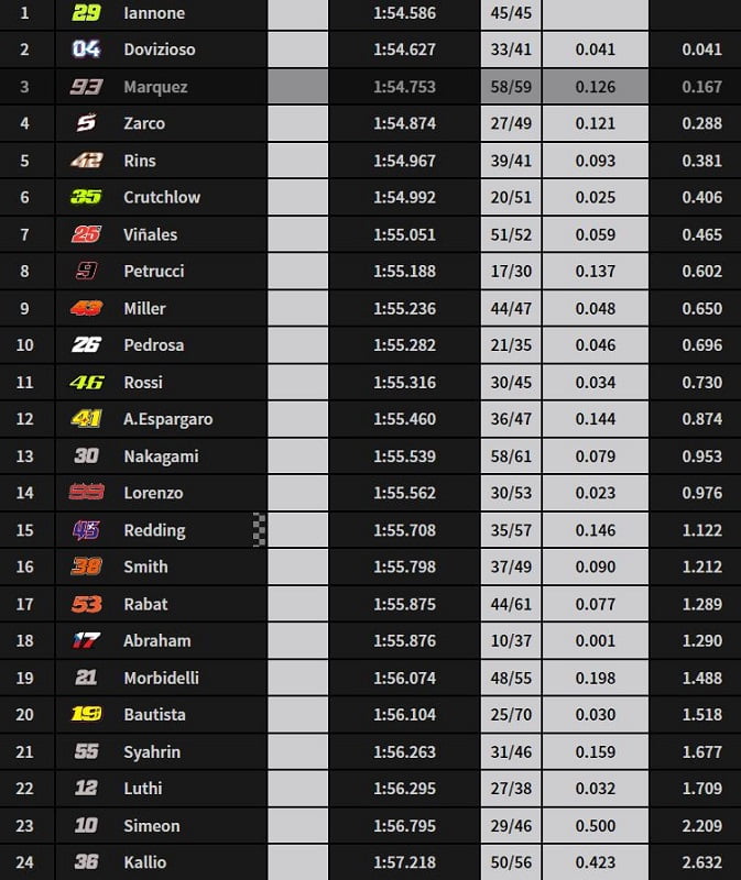 Andrea « The Maniac » Iannone a réalisé le meilleur chrono en 1’54.586, avec 0,041 d’avance sur Dovizioso, 0.167 sur Marc Marquez et 0.288 sur Johann Zarco.