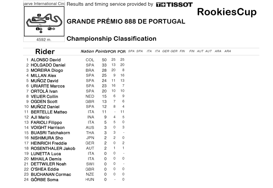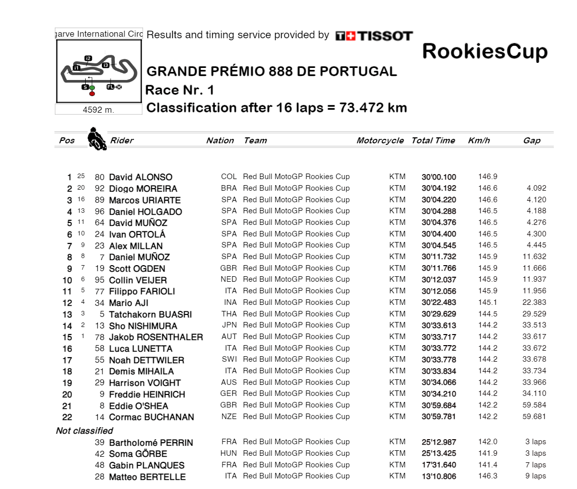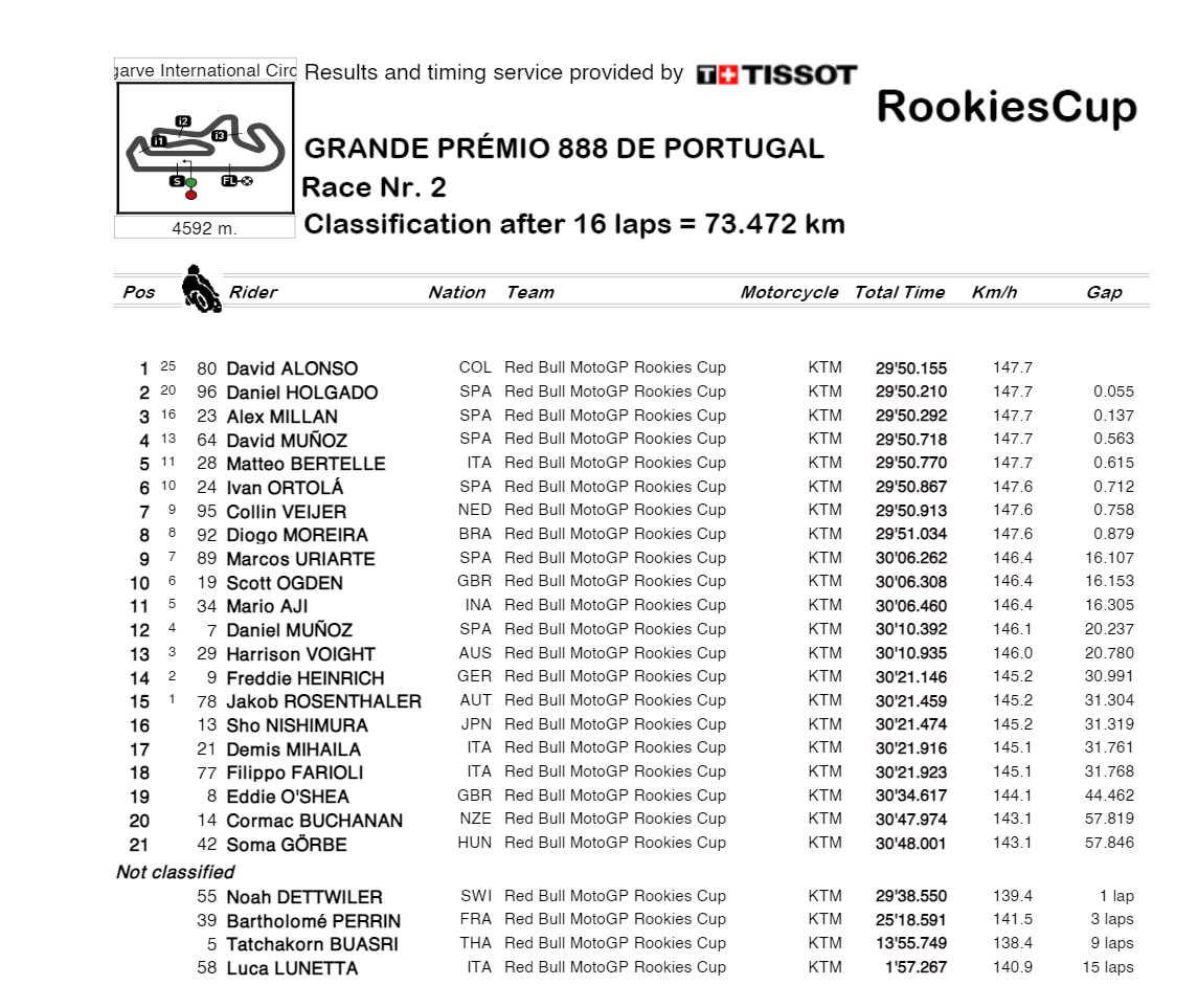 David Alonso, qui avait remporté une seule victoire lors de sa première saison l’année dernière en Aragon, revient sur ce WE Portugais, parfait pour lui : « C’était incroyable, j’ai fait une très bonne course. C’était différent d’hier car hier j’ai gagné seul et aujourd’hui J’ai gagné dans un combat jusqu’à la ligne. C’est très positif pour moi de gagner de ces deux manières. »