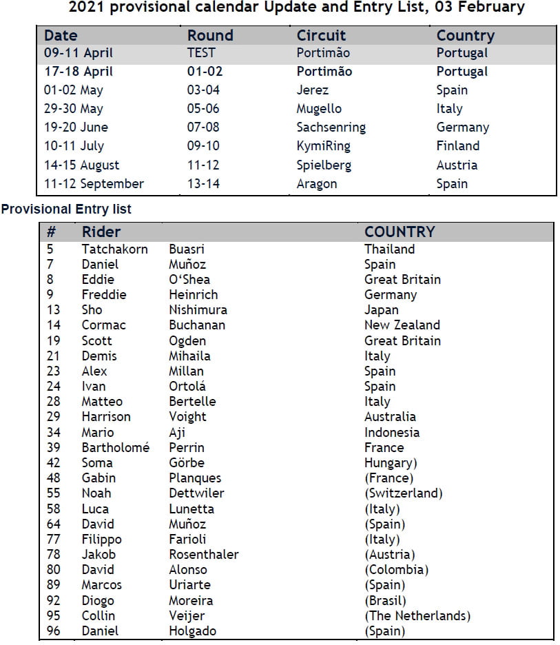 Le premier rendez-vous aura lieu du 9 au 11 avril à Portimão et, si l’on considère le classement de la saison 2020 remportée par Pedro Acosta qui roulera en mondial chez Red Bull KTM Ajo cette année, les frères Muñoz, David et Daniel, seront de sérieux candidats au titre, ayant terminé respectivement 2e et 7e en 2020 !