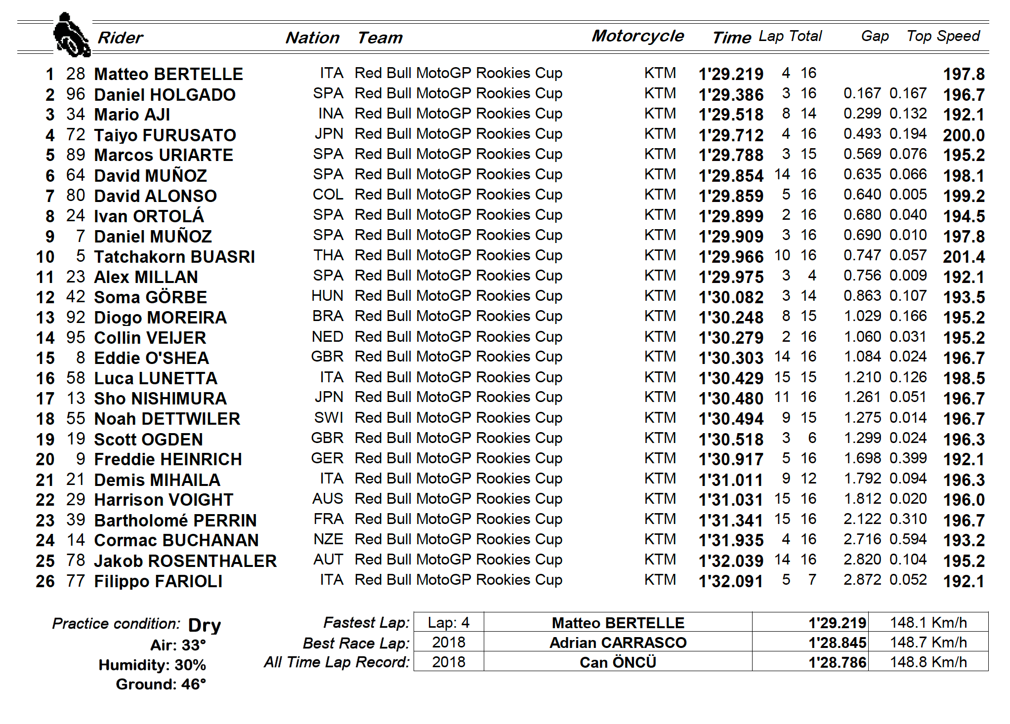 David Muñoz et David Alonso, dans cet ordre, n’ont quant à eux pu faire mieux que sixième et septième sur la grille, ce qui promet un départ des plus tendus, a fortiori qu’il faudra négocier les premiers tours dans le peloton ! En ce qui concerne Diogo Moreira, il faut descendre au 13e rang pour trouver trace du pilote brésilien, auteur d’une prestation décevante hier lors des qualifications.