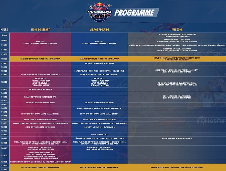 Le programme détaillé du Red Bull Motormania qui se déroulera samedi 13 septembre sur le circuit de Nevers Magny-cours.