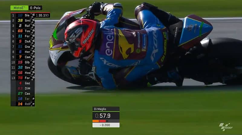 Partant dans l’ordre inverse du classement combiné pour un unique tour, la hiérarchie n’a logiquement pas cessé d’évoluer pour nous présenter d’abord Sete Gibernau (Join Contract Pons 40) en tête, puis Alex De Angelis (OCTO Pramac MotoE) en 1’35.774 après les 6 premiers pilotes (donc les 6 plus lents).