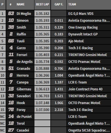 Après un bon moment, Mike Di Meglio (EG 0,0 Marc VDS) s’emparait du leadership en 1’35.182 et le conservait jusqu’à la fin, Héctor Garzó, le dernier concurrent à partir, se faisant une chaleur lors de son tour chrono.