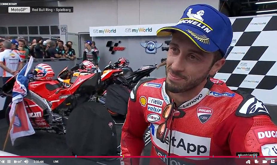 A peine descendu de sa Ducati GP19 officielle après avoir remporté le Grand Prix d’Autriche sur le circuit du Red Bull Ring, Andrea Dovizioso s’est confié devant la caméra du site MotoGP.com avec la joie d’avoir fait quelque chose d’exceptionnel…