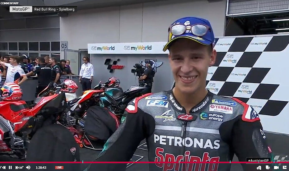A peine descendu de sa Yamaha M1 du team satellite Petronas Yamaha SRT après avoir obtenu la 3e place du Grand Prix d’Autriche sur le circuit du Red Bull Ring, Fabio Quartararo s’est confié devant la caméra du site MotoGP.com avec la satisfaction d’avoir fait une course parfaite…