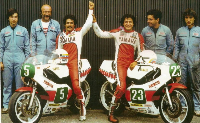 Venemotos, importateur Yamaha au pays, avait monté une structure de Grands Prix afin de promouvoir cette jeunesse passionnée. En 1983, il est engagé en 250cc aux côtés de Cecotto et Carlos Lavado, deux légendes. Malheureusement, l’expérience du quart de litre ne fonctionne pas. Un podium à Assen en trois ans, c’est maigre. À 25 ans, le natif d’Alba Adriatica est sans guidon en mondial. Quelques piges sur Rotax, puis un retour sur Yamaha, toujours en 250cc, n’y changent rien.