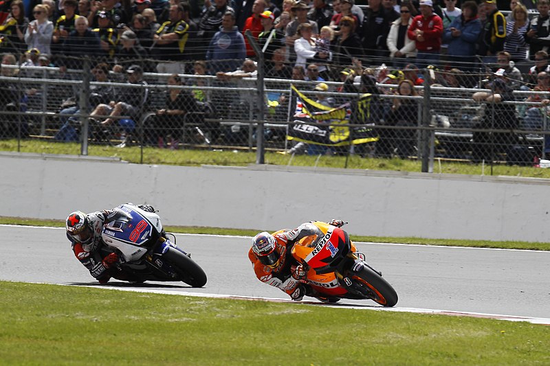 Pedrosa VS Lorenzo. En réalité, les deux rivaux n’avaient jamais pu croiser le fer en MotoGP, face à face, pour une couronne mondiale. Cette manche allemande galvanisa Dani, mué en machine de guerre. Victoire à Indianapolis puis à Brno, dans une explication entrée au panthéon, peut-être exagérément d’ailleurs. L’officiel Repsol Honda arrive en pleine confiance à Misano. Dès le départ donné, Lorenzo s’envole sur l’une de ses pistes préférées, tandis que Dani est étrangement englué dans le peloton. C’était l’erreur à ne pas commettre. Dans le premier tour, Héctor Barberá l’empale et met fin à ses espoirs de triplé. Jorge triomphe et compte désormais 38 points d’avance.
