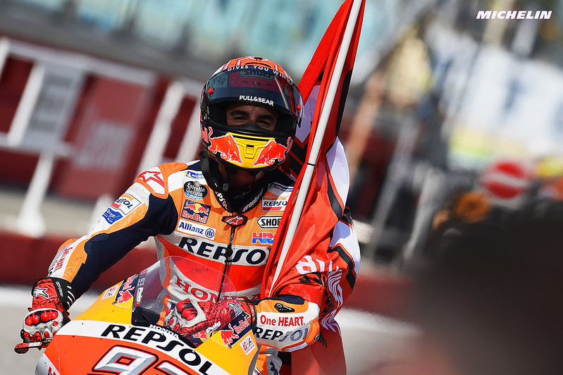 En arrivant en Émilie-Romagne, le suspense pour le titre n’est plus. Certes, Marc Márquez avait chuté lors du Grand Prix des Amériques, pourtant l’un de ses rendez-vous fétiches, mais même pas par sa faute. Hormis cette déconvenue, il n’avait jamais terminé au-delà de la deuxième position, une statistique affolante. Plus qu’en 2014, l’Espagnol roule sur la discipline. Comme s’il ne pouvait rien lui arriver, il multipliait les sauvetages en catastrophe ; du vrai MotoGP champagne, avec des chutes lors des essais, mais des coups de maître le dimanche. Avant de poser ses roue sur le tracé de Misano, il compte déjà six victoires, huit poles et sept meilleurs tours en course en seulement douze manches.
