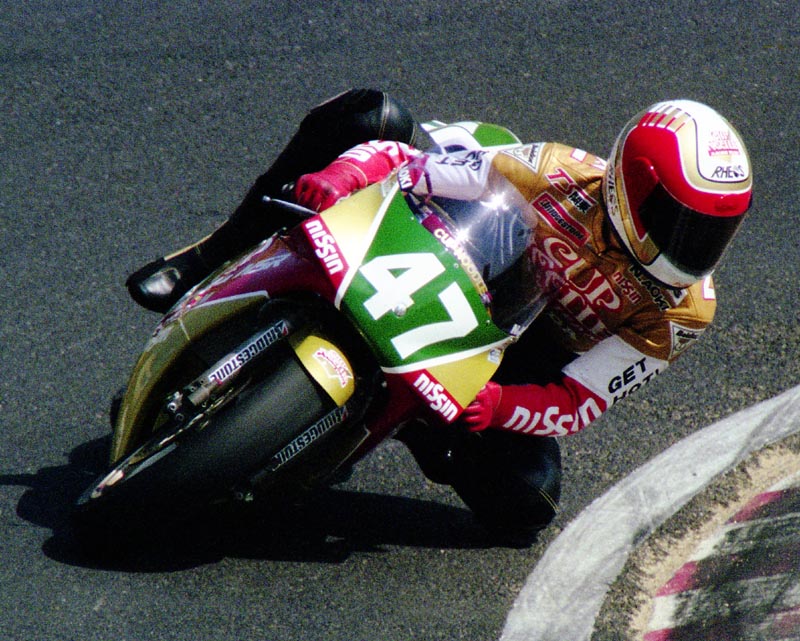Né en 1971, il est le plus âgé des trois, mais aussi celui qui a la plus longue carrière. Il fait sa première apparition en Grands Prix à l’occasion de la manche japonaise en 1990. Il n’est pas ridicule en tant que wildcard, mais doit attendre 1993 pour se voir offrir un guidon à temps complet en 250cc, chez Kanemoto – Honda – excusez du peu. Au sein de la formation nippone, il décroche sa première victoire au bout de la deuxième course seulement, en Australie. Alors qu’il est très prometteur, il s’agit là de son seul succès en carrière. Mais rassurez-vous, il a encore de belles années devant lui.