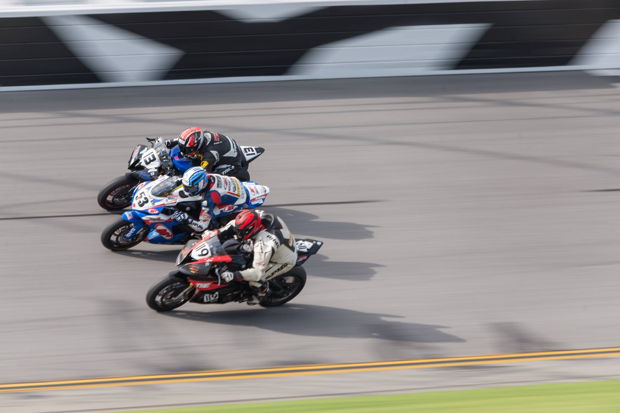 Le départ Daytona est un peu spécial parce qu’on ne part pas de la piste, mais des stands ! On a de la chance que la voie des stands soit plus grande que nos autoroutes françaises… Il y a donc la première vague de pilotes qui s’élance. Je regarde le type avec son drapeau vert, il regarde les autres motos partir, et d’un coup il agite le drapeau. Merde, il faut partir, c’est le départ ! Après le premier tour, j’ai déjà doublé la deuxième vague de pilotes, je remonte assez vite sur la première et les double un par un. Je me retrouve deuxième de la course. Le premier, c’est une 1000cc. Je ne m’occupe pas de lui parce que je sais qu’il devra faire deux arrêts au stand, contre un pour moi (les 1000cc consomment plus d’essence que les 600cc). Le troisième, qui lui est en 600cc comme moi, me colle aux basques. Il est moins vite que moi, mais avec les aspirations, il arrive à me tenir facilement. J’en garde un peu sous le coude et attend le bon moment pour rouler plus vite. J’attends de rattraper un groupe d’attardés pour pouvoir passer les virages vites, et me servir de leurs aspirations dans le banking, ce qui me permettra de creuser un petit écart, assez pour qu’il perde mon aspiration. Je trouve le bon moment au bout de 6 tours. Je mets mon plan en action et ça marche. Le reste de la course, j’ai essayé de pousser mes limites pour prendre de l’expérience en vue des 200 miles de l’an prochain. Voir les points où il faudra que je me concentre d’avantage, comprendre là ou il faut pousser, continuer d’apprendre comment doubler dans le banking, etc. Tout marche à la perfection. Mon arrêt au stand se passe tellement vite que j’ai à peine eu le temps de boire de l’eau. Mon équipe ne s’était pas vraiment entrainée. Ils m’ont dit qu’ils avaient du talent quand je leur ai posé la question de savoir comment ils avaient fait pour être aussi rapides ! Surement… En tout cas, ils sont bons ! Je passe la ligne d’arrivé avec 42 secondes d’avance sur le deuxième, et 1 minute d’avance sur le troisième !