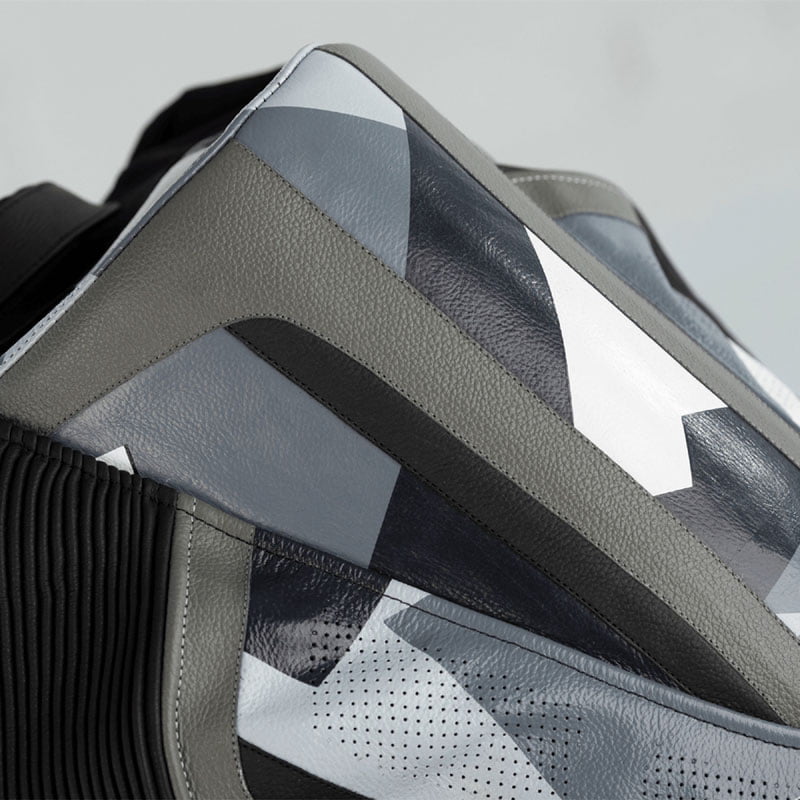Maîtrise dans l’intégration d’airbags. L’équipe en charge du développement sont tous des motards passionnés et pratiquent la compétition moto à haut niveau, ils mettent un point d’honneur à ce que les produits livrés aux clients soient conformes à leur cahier des charges. La combinaison Pro Series Airbag en est l’un des exemples, fabriquée à partir de pièces en cuir de bovin de qualité (pleine fleur d’une épaisseur de 1,1 à 1,3 mm) dont certaines sont doublées pour une meilleure résistance en cas de chute et d’autres micros perforées pour favoriser la circulation de l’air à l’intérieur de l’équipement. Pour le confort et l’aisance, en complément des diverses zones extensibles, des empiècements en néoprène sont appliqués aux poignets, aux chevilles et au cou, l’ensemble contribuant ainsi au confort général à l’usage. Le cuir de bovin employé pour la confection de l’équipement est de qualité supérieure. Souple et résistant il est aussi employé pour confectionner les pièces extensibles (quatre directions) pour apporter de l’amplitude dans les mouvements des bras et des jambes, aussi bien sur qu’à côté de la moto. Elles ont vocation à s’étirer pour accompagner le déploiement du sac airbag interne lorsqu’il se déclenche et augmenter ainsi le volume intérieur et ne pas comprimer le pilote. Pour compléter cette construction des zones en stretch s’étendent le long du corps, de chaque côté jusqu’aux bras et le haut de la poitrine.