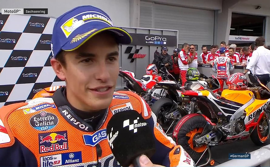 A peine descendu de sa moto, le 7 fois poleman et 7 fois vainqueur consécutif de ce Grand Prix d’Allemagne s’est confié à la caméra du site MotoGP.com