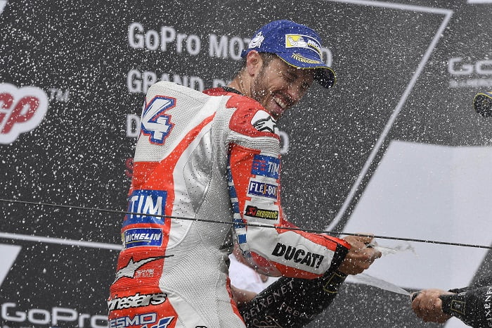 Sur le podium MotoGP du Sachsenring il y avait un pilote aux sentiments mitigés. Celui-là était un Andrea Dovizioso dont le sourire timide contrastait avec l’humeur extatique des deux pilotes Honda à côté de lui. Pendant que Crutchlow et Márquez savouraient, l’officiel Ducati refaisait déjà la course malgré cette troisième place conquise sur un tracé ennemi des Desmosedici. Une position intermédiaire compliquée. Comme ses pneus.
