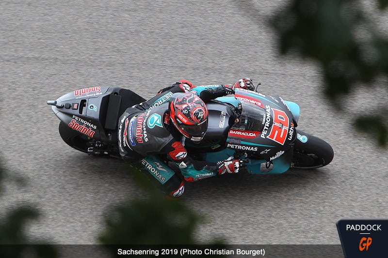 Premier ce matin, troisième cet après-midi, Fabio Quartararo n’est pas passé à côté de sa première journée en Allemagne, même s’il s’est énervé en fin de FP2 contre Franco Morbidelli et Takaaki Nakagami qui étaient plus lents que lui sur la trajectoire.