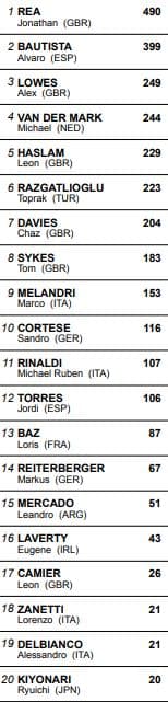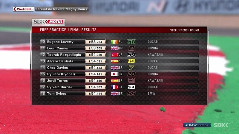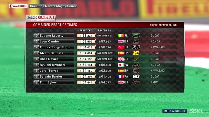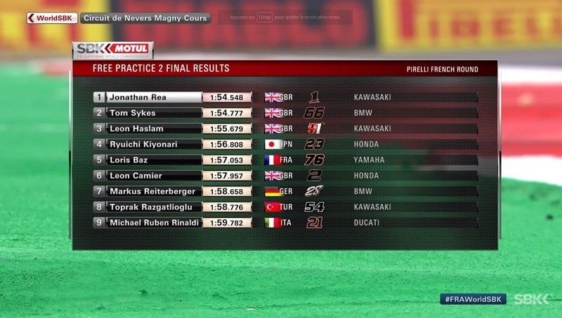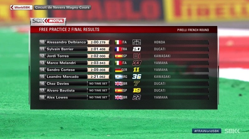 Tom Sykes lui succédait en 1’54.633, puis Michael-Ruben Rinaldi réalisait un tour en 1’54.183. Il précédait avec sa Ducati les Yamaha de Marco Melandri et Michael van der Mark. Bautista ne semblait pas à l’aise avec le vingtième et dernier temps à un quart d’heure de la fin de cette première séance libre.