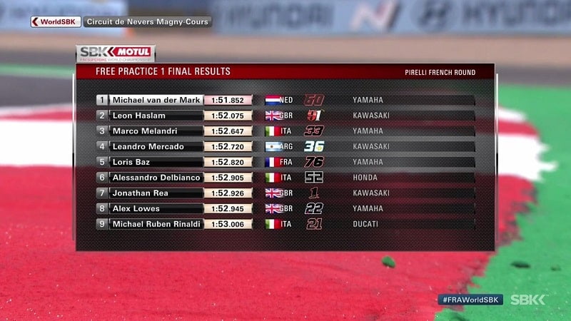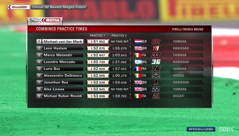 A deux minutes de la fin, Johnny Rea tournait en 1’52.926, puis juste après Michael van der Mark réalisait 1’52.784. Sous le drapeau à damier, van der Mark améliorait en 1’51.852, 0.2 devant Haslam et 0.7 devant Melandri, 0.8 devant Melandri et 0.9 devant Baz.