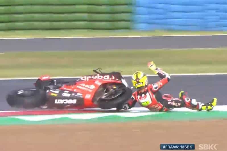 Álvaro Bautista était le premier à chuter, sans gravité dans le Virage 1. Il parvenait à rentrer en roulant lentement à son stand.