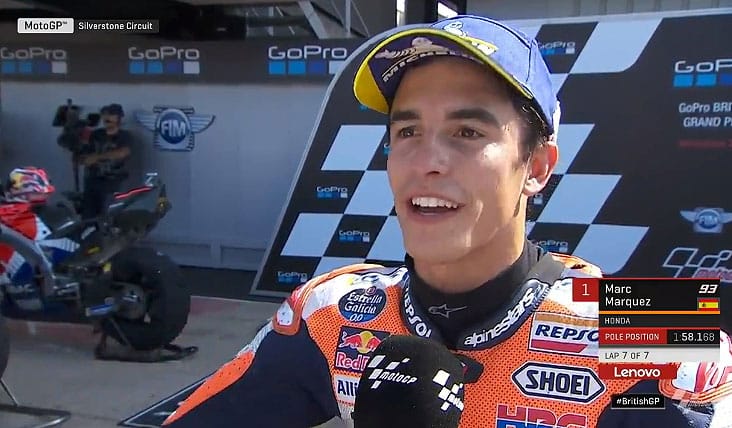 A peine descendu de sa Honda RC213V officielle après avoir obtenu la pole position sur la grille de départ du Grand Prix de Grande-Bretagne sur le circuit de Silverstone, la 60e en catégorie reine, Marc Márquez s’est confié devant la caméra du site MotoGP.com avec la satisfaction d’avoir été le plus malin…