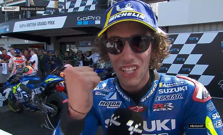 A peine descendu de sa Suzuki GSX-RR officielle après avoir remporté le Grand Prix de Grande-Bretagne sur le circuit de Silverstone dans le dernier virage, Álex Rins s’est confié devant la caméra du site MotoGP.com avec une joie bien justifiée...